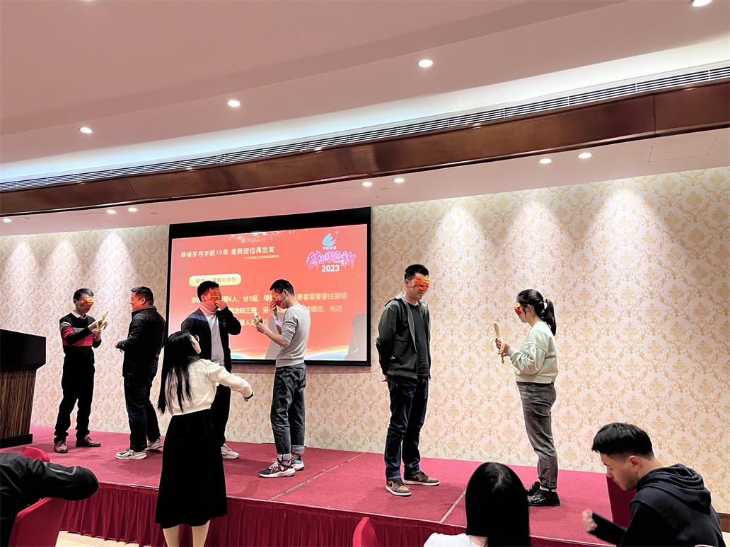 頒獎結束,當然要有小游戲來熱熱場子,調動氣氛。現場準備了2個游戲,蒙眼吃香蕉和蜻蜓點水,大家都踴躍參加小游戲,兩兩搭檔或者三人一組,配合默契,親密無間,既拉近了彼此的距離,也意識到了團隊合作的重要性。游戲過程中,大家都感到歡樂、放松,同時現場氣氛也異常活躍,臺上的參賽者搞笑的動作和不知所措的小手惹得大家捧腹大笑,時常有人吹起口哨,喊起口號,為參賽者加油助威。游戲結束之后,獲勝者還獲得紅包一個。