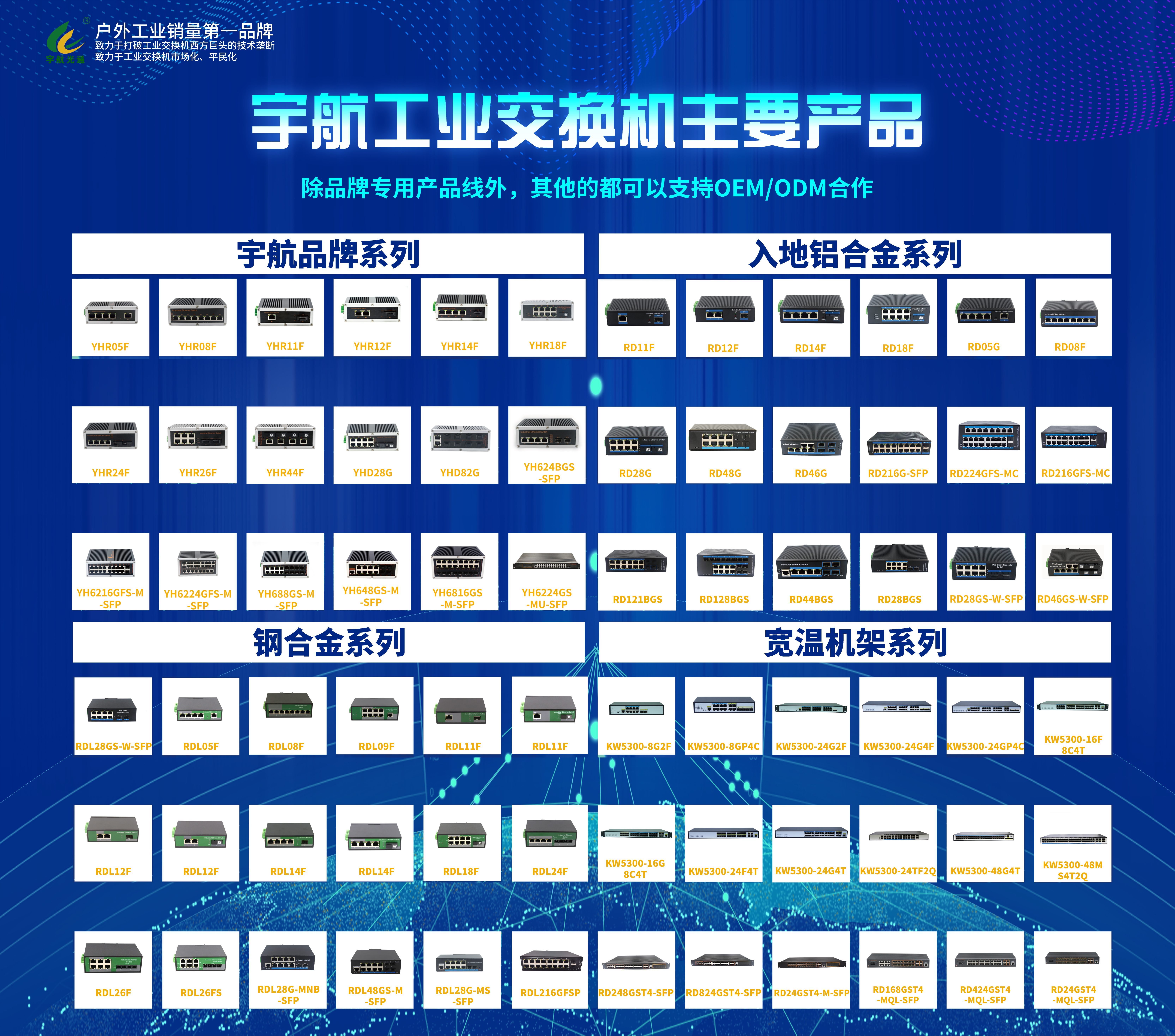 深圳市宇航光通科技有限公司自2012年成立以來,是一家聚焦于工業交換機的源頭廠商,也是國產工業交換機最大的源頭廠商,宇航專注于工業交換機品牌市場和中大型客戶OEM/ODM市場。產品包括工業級收發器、工業級交換機、工業級POE交換機、二層網管型工業級交換機、三層網管型工業級萬兆交換機、機框式插卡工業交換機、純國產工業交換機等。多年來,宇航致力于打破工業交換機西方巨頭的技術壟斷,致力于工業交換機市場化、平民化。宇航,戶外工業交換機銷量第一品牌!