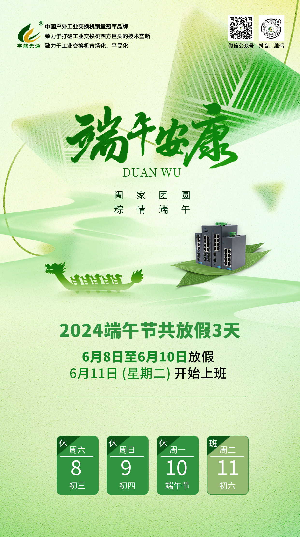 根據(jù)國家法定假期的規(guī)定,宇航工業(yè)交換機2024年端午節(jié)放假安排通知如下: