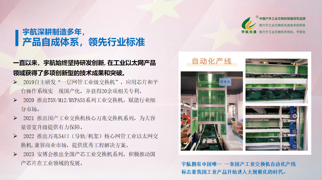 宇航作為一家專注于工業(yè)以太網(wǎng)交換機研發(fā)、生產(chǎn)、銷售和服務于一體的國家專精特新小巨人企業(yè)、國家高新技術企業(yè),我們深知自身的成長與發(fā)展離不開祖國的繁榮與昌盛。多年來,我們始終秉承“創(chuàng)新驅動,質量為本”的理念,為客戶提供高性能、高穩(wěn)定性的工業(yè)交換機產(chǎn)品,以實際行動為祖國的建設貢獻力量。工業(yè)交換機作為現(xiàn)代工業(yè)通信的重要組成部分,承擔著數(shù)據(jù)傳輸、信息交換等關鍵任務,也在智能制造、智慧城市、新能源等領域發(fā)揮著舉足輕重的作用。宇航始終緊跟時代步伐,不斷創(chuàng)新技術,提升產(chǎn)品品質,以滿足日益增長的市場需求。
