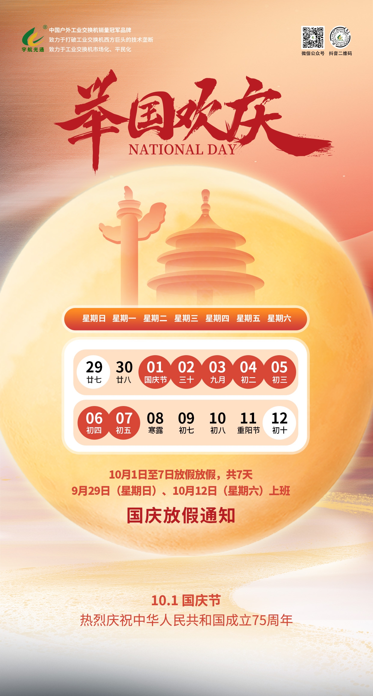 習主席言:“愛國主義,是我們民族精神的核心,是中華民族團結奮斗、自強不息的精神紐帶”。在這個金秋送爽、普天同慶的時刻,我們迎來了祖國母親的75歲華誕,宇航工業(yè)交換機同事祝福偉大的祖國生日快樂,繁花似錦!同時,也向大家致以最誠摯的節(jié)日祝福!