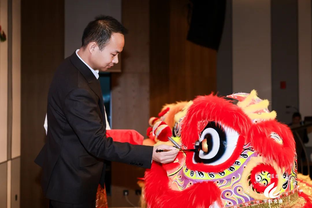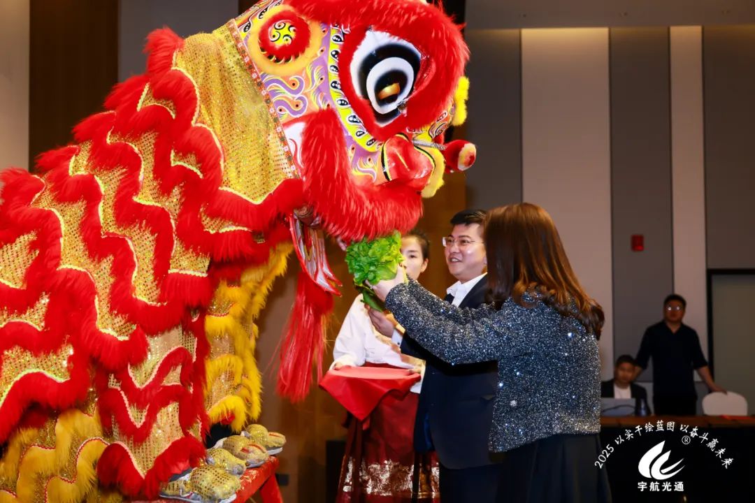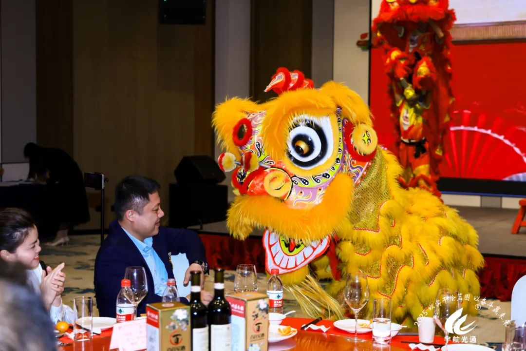 隨著劉總宣布晚宴開始,整個(gè)活動(dòng)現(xiàn)場的氣氛達(dá)到了一個(gè)新的高潮。主持人以熱情洋溢的語言邀請(qǐng)瑞獅上臺(tái),無疑為晚宴增添了一抹獨(dú)特的文化色彩。張總親自進(jìn)行點(diǎn)睛之筆,為瑞獅點(diǎn)上慧眼,寓意著喚醒獅子的靈氣,帶來吉祥和好運(yùn)。緊接著,劉總和董總上臺(tái)進(jìn)行采青儀式。采青是舞獅活動(dòng)中重要的部分,象征著生意興隆、財(cái)源廣進(jìn)。最后三位領(lǐng)導(dǎo)人和獅子進(jìn)行了合影留念。