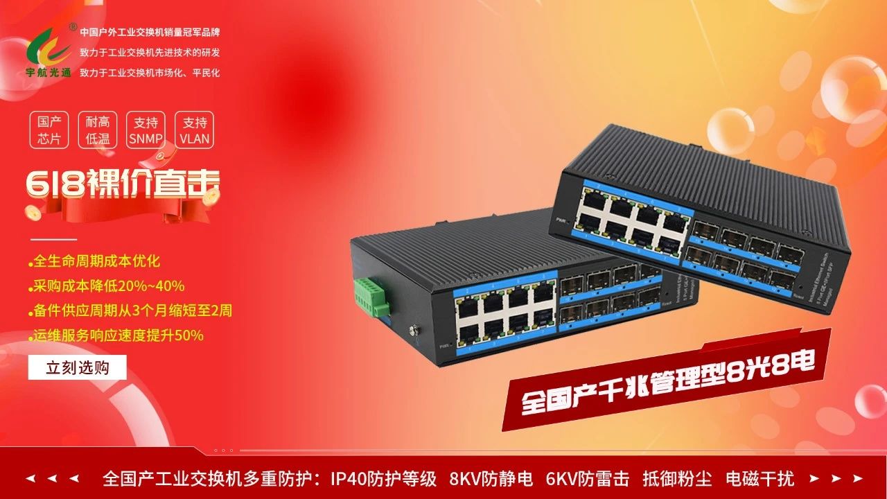 值此618之際,為回饋廣大客戶長期以來的支持與信賴,宇航特別推出三款爆款工業(yè)交換機(jī)裸價直供,品質(zhì)不變,價格直降!經(jīng)過嚴(yán)苛的環(huán)境測試,可在-40℃至80℃的極端溫度下穩(wěn)定運行。我們承諾:所有產(chǎn)品保持原廠品質(zhì)不變,價格直降到底!更提供行業(yè)領(lǐng)先的3-5年超長質(zhì)保,24小時快速響應(yīng)服務(wù),讓您買得放心、用得安心。