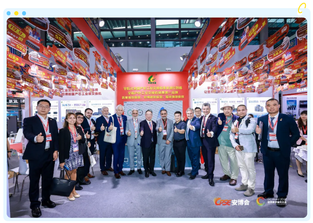 展會期間,我們很榮幸地迎來了中國國際社會公共安全博覽會組委會主席、世界數字城市大會主席、歐洲科學院院士、深安協&深交協創會會長楊金才等全國多地行業協會與機構的領導和專家蒞臨交流。嘉賓們對宇航全系列全國產工業交換機的技術突破與規模化應用成果給予了高度認可,并充分肯定了我們在推動工業網絡自主可控、守護關鍵基礎設施網絡安全方面所做出的努力。這份認可與鼓勵,是我們前行路上最寶貴的動力。在此,向所有關心和支持宇航工業交換機的朋友們致以最誠摯的感謝!