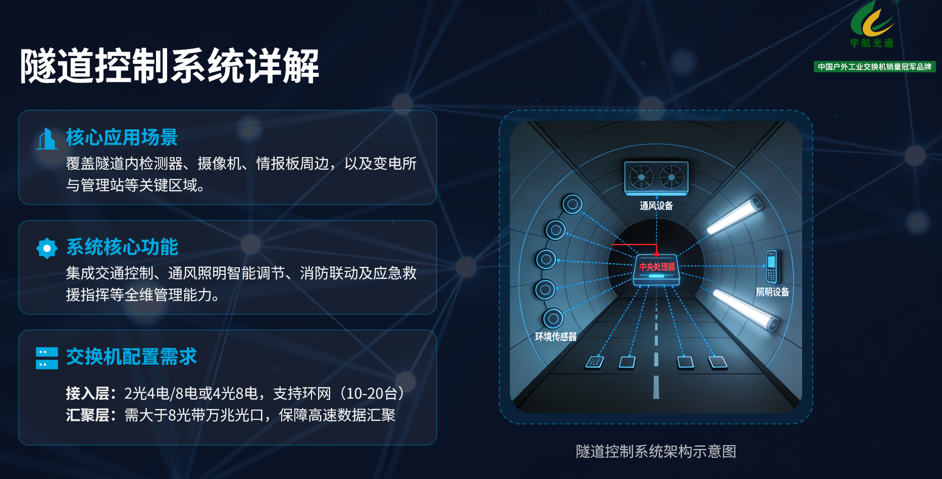 高速公路的穩(wěn)定運行,離不開收費、監(jiān)控、隧道、ETC、骨干網(wǎng)、情報板、應(yīng)急救援、服務(wù)區(qū)八大系統(tǒng)的高效協(xié)同——工業(yè)交換機作為各系統(tǒng)數(shù)據(jù)傳輸?shù)暮诵臉屑~,其選型與組網(wǎng)方案直接影響整體網(wǎng)絡(luò)的穩(wěn)定性與可靠性。3月下旬,宇航工業(yè)交換機-戰(zhàn)略合作部負責人楊慶輝,圍繞八大系統(tǒng)的真實組網(wǎng)需求,從拓撲架構(gòu)到設(shè)備選型,系統(tǒng)梳理了一套可落地的應(yīng)用方案。