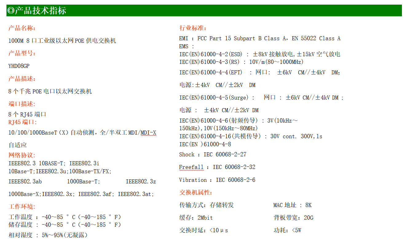 8路千兆電口工業級以太網交換機,支持8個10Base-T/100Base-TX POE電口。產品符合FCC、CE、ROHS標準。YH300-08FP交換機具有-40℃~85℃的工作溫度,具有超強的堅固度能適應各種嚴苛環境,也可以非常方便的安置在空間緊湊的控制箱中。導軌的安裝特性、寬溫操作及擁有IP40防護等級的外殼及LED指示燈,使YH300-08FP成為一個即插即用的工業級設備,為用戶的以太網設備聯網提供可靠、便捷的解決方案。