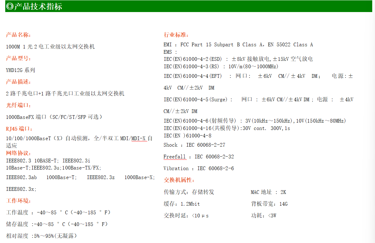 2路千兆電口+1路千兆FX光口工業(yè)級以太網(wǎng)交換機,支持2個100Base-T/1000Base-TX電口和1個1000Base-X光口。產(chǎn)品符合FCC、CE、ROHS標準。YH300-12G系列交換機具有-40℃~85℃的工作溫度,具有超強的堅固度能適應(yīng)各種嚴苛環(huán)境,也可以非常方便的安置在空間緊湊的控制箱中。導(dǎo)軌的安裝特性、寬溫操作及擁有IP40防護等級的外殼及LED指示燈,使YH300-12G成為一個即插即用的工業(yè)級設(shè)備,為用戶的以太網(wǎng)設(shè)備聯(lián)網(wǎng)提供可靠、便捷的解決方案。