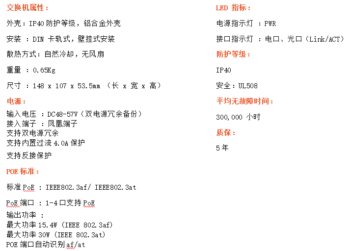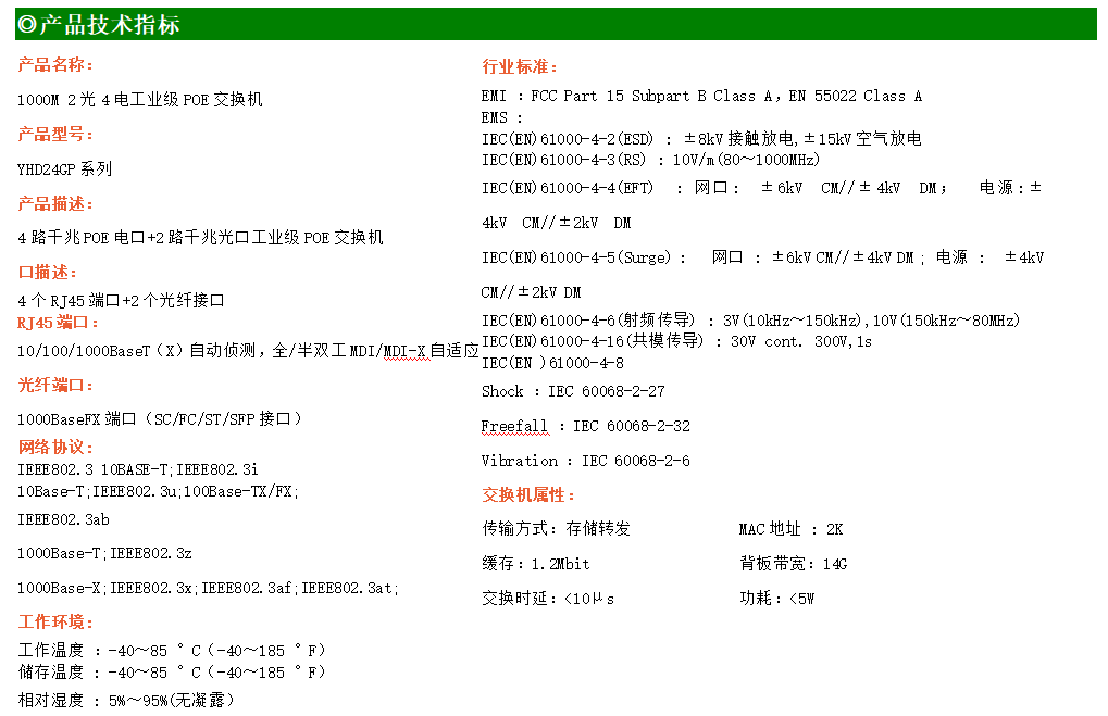 4路千兆POE電口+2路千兆FX光口工業級以太網POE交換機,支持4個10/100/1000Base-TX電口和2個1000Base-X光口。產品符合FCC、CE、ROHS標準。YHD24GP-SFP交換機具有-40℃~85℃的工作溫度,具有超強的堅固度能適應各種嚴苛環境,也可以非常方便的安置在空間緊湊的控制箱中。導軌的安裝特性、寬溫操作及擁有IP40防護等級的外殼及LED指示燈,使YH300-24GP系列成為一個即插即用的工業級設備,為用戶的以太網設備聯網提供可靠、便捷的解決方案。