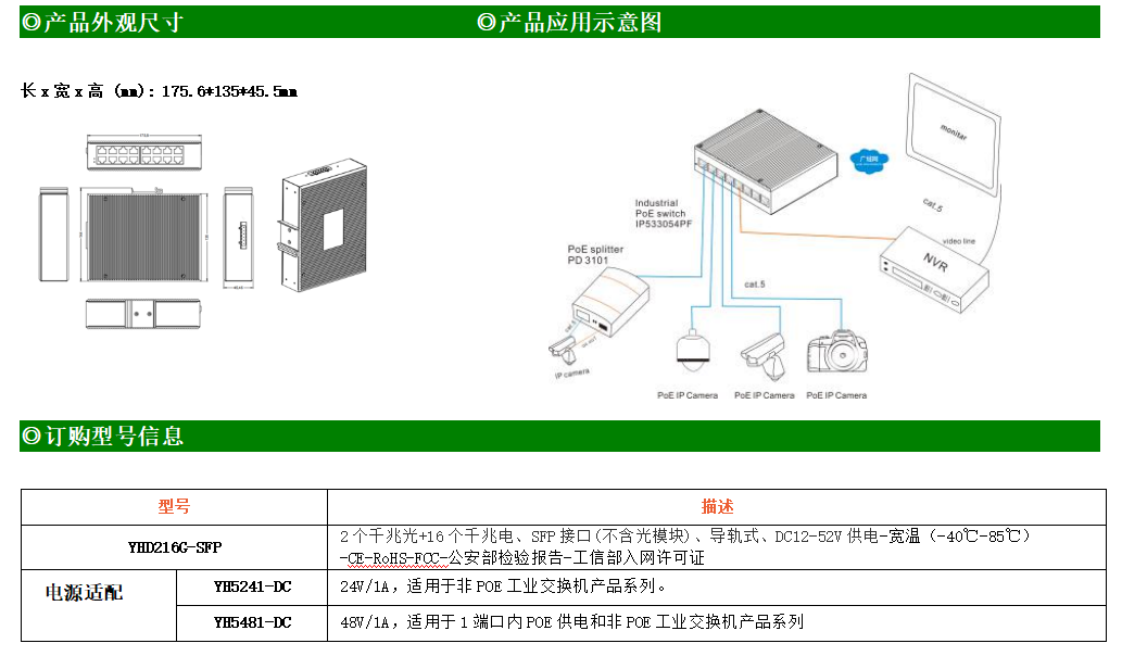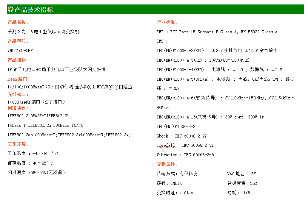 16路千兆電口+2路千兆光口工業(yè)級(jí)以太網(wǎng)交換機(jī),支持16個(gè)10Base-T/100Base-T/1000Base-TX電口和2個(gè)1000Base-X光口。產(chǎn)品符合FCC、CE、ROHS標(biāo)準(zhǔn)。YH300-216G-SFP交換機(jī)具有-40℃~80℃的工作溫度,具有超強(qiáng)的堅(jiān)固度能適應(yīng)各種嚴(yán)苛環(huán)境,也可以非常方便的安置在空間緊湊的控制箱中。導(dǎo)軌的安裝特性、寬溫操作及擁有IP40防護(hù)等級(jí)的外殼及LED指示燈,使YH300-216G-SFP成為一個(gè)即插即用的工業(yè)級(jí)設(shè)備,為用戶的以太網(wǎng)設(shè)備聯(lián)網(wǎng)提供可靠、便捷的解決方案。