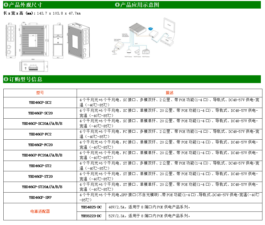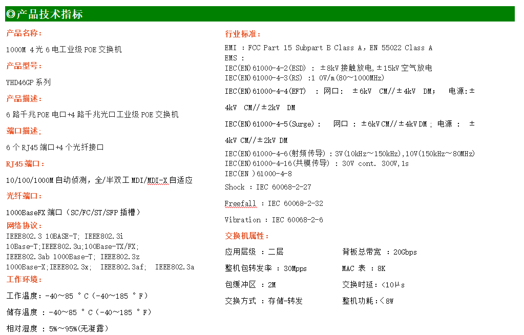 6路千兆POE電口+4路千兆FX光口工業級以太網POE交換機,支持6個10/100/1000Base-TX電口和4個1000Base-X光口。產品符合FCC、CE、ROHS標準。YHD46GP系列交換機具有-40℃~85℃的工作溫度,具有超強的堅固度能適應各種嚴苛環境,也可以非常方便的安置在空間緊湊的控制箱中。導軌的安裝特性、寬溫操作及擁有IP40防護等級的外殼及LED指示燈,使YH300-46GP系列成為一個即插即用的工業級設備,為用戶的以太網設備聯網提供可靠、便捷的解決方案。