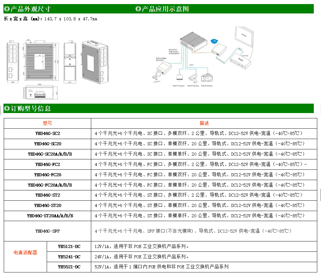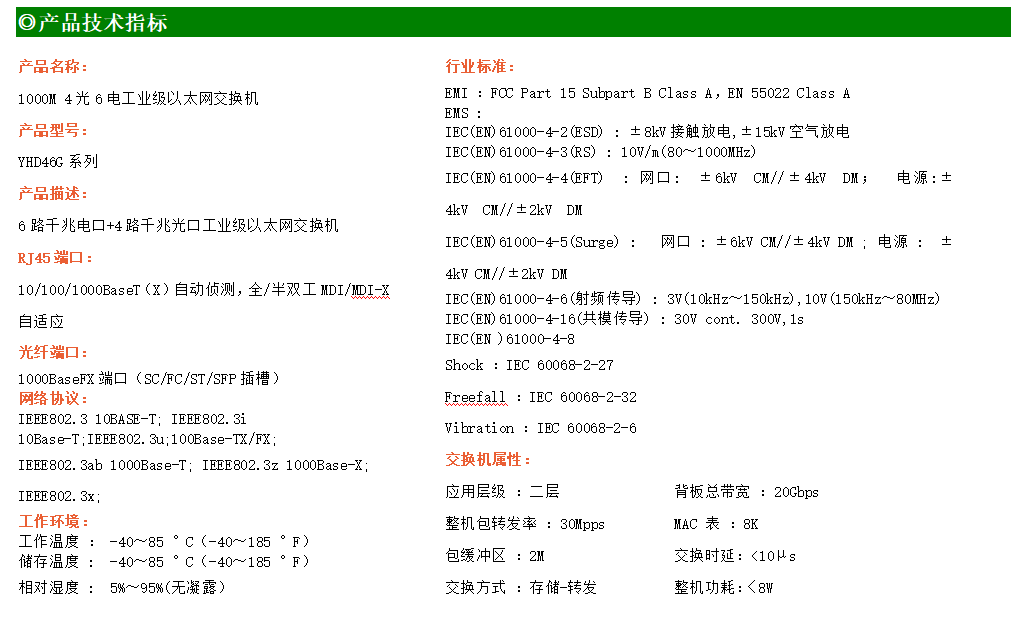 6路千兆電口+4路千兆FX光口工業(yè)級(jí)以太網(wǎng)交換機(jī),支持6個(gè)100Base-T/1000Base-TX電口和4個(gè)1000Base-X光口。產(chǎn)品符合FCC、CE、ROHS標(biāo)準(zhǔn)。YH300-46G交換機(jī)具有-40℃~85℃的工作溫度,具有超強(qiáng)的堅(jiān)固度能適應(yīng)各種嚴(yán)苛環(huán)境,也可以非常方便的安置在空間緊湊的控制箱中。導(dǎo)軌的安裝特性、寬溫操作及擁有IP40防護(hù)等級(jí)的外殼及LED指示燈,使YH300-46G成為一個(gè)即插即用的工業(yè)級(jí)設(shè)備,為用戶(hù)的以太網(wǎng)設(shè)備聯(lián)網(wǎng)提供可靠、便捷的解決方案。