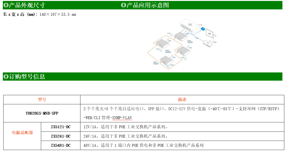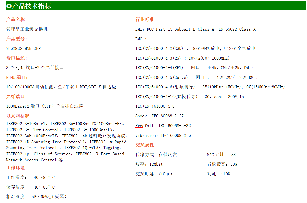 YHH600-28GS-MNB-SFP是網管型工業以太網交換機,產品符合FCC、CE、RoHS標準。支持2個千兆光口和8個千兆電口;支持工業現場所需的以太網二層協議,保證通信網絡的穩定性;該系列交換機采用低功耗、無風扇設計,確保無噪聲干擾,同時支持-40~85℃工作溫度和良好的EMC電磁兼容性能,保證在惡劣的工業環境中保持穩定的工作,為工廠自動化,智能交通,視頻監控等工業應用領域組建快速穩定的網絡終端接入網絡提供安全可靠的解決方案。