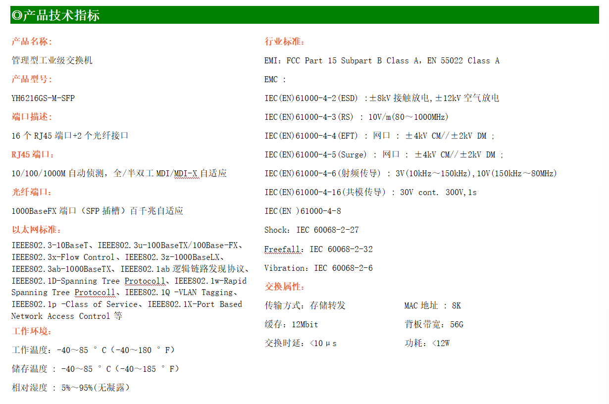 YH600-216GS-M是網管型工業以太網交換機,產品符合FCC、CE、RoHS標準。支持2個千兆光口和16個千兆電口;支持工業現場所需的以太網二層協議,保證通信網絡的穩定性;該系列交換機采用低功耗、無風扇設計,確保無噪聲干擾,同時支持-40~80℃工作溫度和良好的EMC電磁兼容性能,保證在惡劣的工業環境中保持穩定的工作,為工廠自動化,智能交通,視頻監控等工業應用領域組建快速穩定的網絡終端接入網絡提供安全可靠的解決方案。