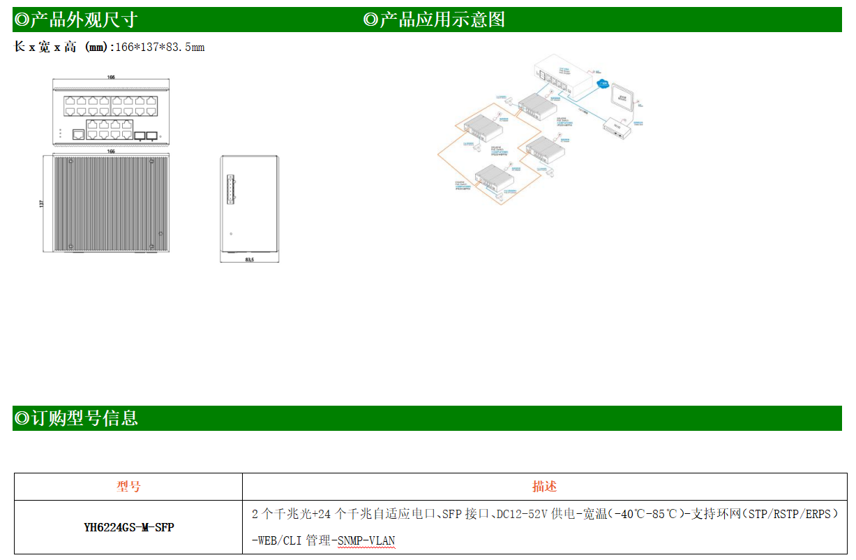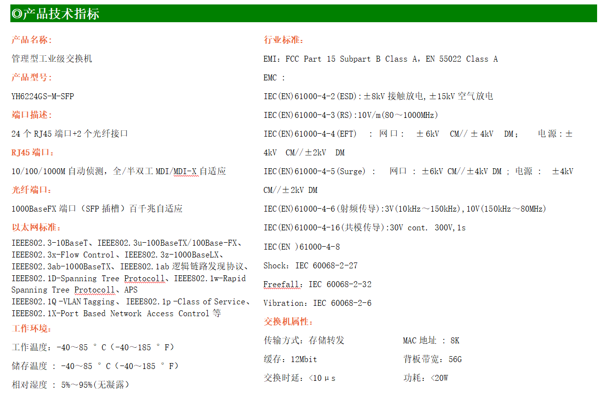 YH600-224GS-M-SFP是網(wǎng)管型工業(yè)以太網(wǎng)交換機,產(chǎn)品符合FCC、CE、RoHS標(biāo)準(zhǔn)。支持2個千兆光口和24個千兆電口;支持工業(yè)現(xiàn)場所需的以太網(wǎng)二層協(xié)議,保證通信網(wǎng)絡(luò)的穩(wěn)定性;該系列交換機采用低功耗、無風(fēng)扇設(shè)計,確保無噪聲干擾,同時支持-40~85℃工作溫度和良好的EMC電磁兼容性能,保證在惡劣的工業(yè)環(huán)境中保持穩(wěn)定的工作,為工廠自動化,智能交通,視頻監(jiān)控等工業(yè)應(yīng)用領(lǐng)域組建快速穩(wěn)定的網(wǎng)絡(luò)終端接入網(wǎng)絡(luò)提供安全可靠的解決方案。