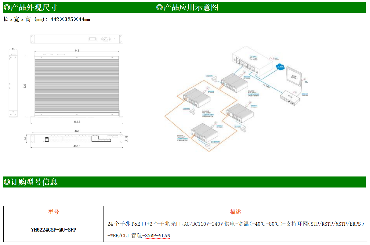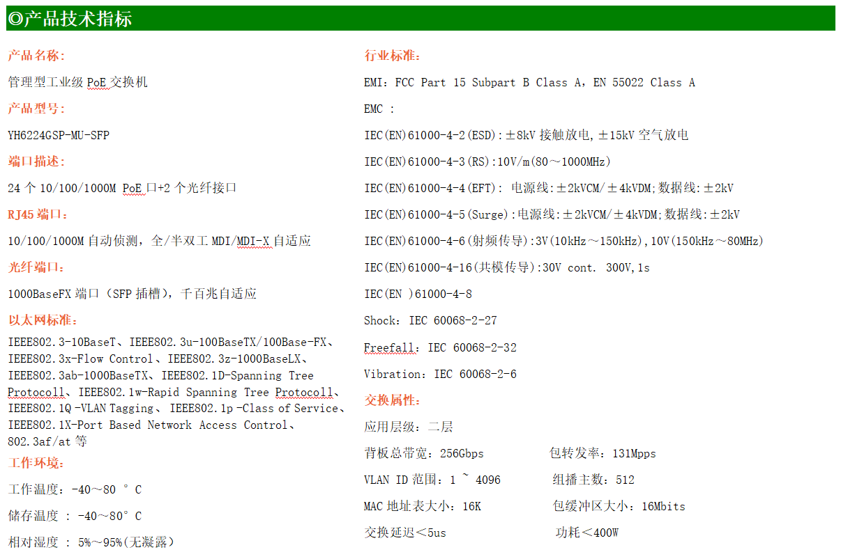 YH600-224GSP-MU-SFP是網(wǎng)管型工業(yè)以太網(wǎng)PoE交換機(jī),產(chǎn)品符合FCC、CE、RoHS標(biāo)準(zhǔn)。可提供24個(gè)千兆PoE端口,所有PoE端口符合IEEE802.3af/at標(biāo)準(zhǔn)。支持工業(yè)現(xiàn)場(chǎng)所需的以太網(wǎng)二層協(xié)議,保證通信網(wǎng)絡(luò)的穩(wěn)定性;該系列交換機(jī)采用低功耗、無(wú)風(fēng)扇設(shè)計(jì),確保無(wú)噪聲干擾,同時(shí)支持-40~80℃工作溫度和良好的EMC電磁兼容性能,保證在惡劣的工業(yè)環(huán)境中保持穩(wěn)定的工作,為工廠自動(dòng)化,智能交通,視頻監(jiān)控等工業(yè)應(yīng)用領(lǐng)域組建快速穩(wěn)定的網(wǎng)絡(luò)終端接入網(wǎng)絡(luò)提供安全可靠的解決方案。