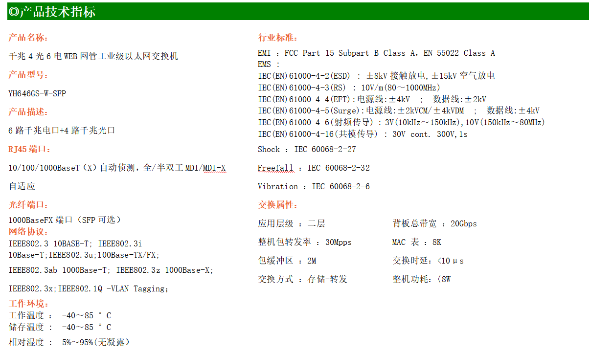 YH600-46GS-SFPWEB網(wǎng)管工業(yè)級以太網(wǎng)交換機,產(chǎn)品符合FCC、CE、ROHS標準,支持工業(yè)現(xiàn)場所需的以太網(wǎng)二層協(xié)議,保證通信網(wǎng)絡的穩(wěn)定性。該系列交換機采用低功耗、無風扇設計,確保無噪聲干擾,同時支持-40~85℃工作溫度和良好的EMC電磁兼容性能,保證在惡劣的工業(yè)環(huán)境中保持穩(wěn)定的工作,為工廠自動化,智能交通,視頻監(jiān)控等工業(yè)應用領(lǐng)域組建快速穩(wěn)定的網(wǎng)絡終端接入網(wǎng)絡提供安全可靠的解決方案。