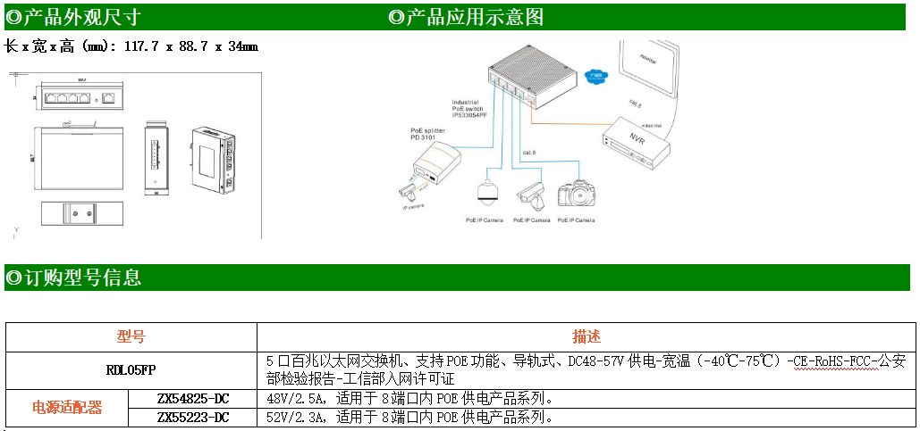 1路百兆上聯電口+4路百兆下聯電口工業級以太網POE交換機,支持1個10/100Base-TX上聯電口和4個10Base-T/100Base-TX下聯POE電口。產品符合FCC、CE、ROHS標準。RDL05F交換機具有-40℃~75℃的工作溫度,具有超強的堅固度能適應各種嚴苛環境,也可以非常方便的安置在空間緊湊的控制箱中。導軌的安裝特性、寬溫操作及擁有IP40防護等級的外殼及LED指示燈,使RDL05FP成為一個即插即用的工業級設備,為用戶的以太網設備聯網提供可靠、便捷的解決方案。