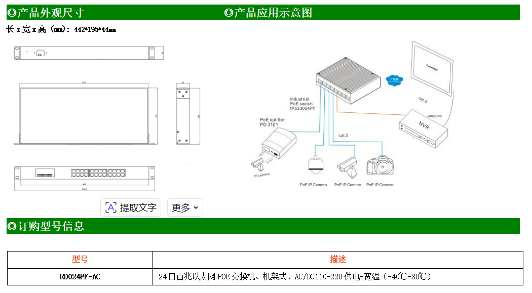 24路百兆電口工業(yè)級以太網(wǎng)交換機,支持24個10Base-T/100Base-TX電口。產(chǎn)品符合FCC、CE、ROHS標(biāo)準(zhǔn)。RD024F交換機具有-40℃~80℃的工作溫度,具有超強的堅固度能適應(yīng)各種嚴(yán)苛環(huán)境,也可以非常方便的安置在空間緊湊的控制箱中。導(dǎo)軌的安裝特性、寬溫操作及擁有IP40防護等級的外殼及LED指示燈,使RD024F成為一個即插即用的工業(yè)級設(shè)備,為用戶的以太網(wǎng)設(shè)備聯(lián)網(wǎng)提供可靠、便捷的解決方案。
