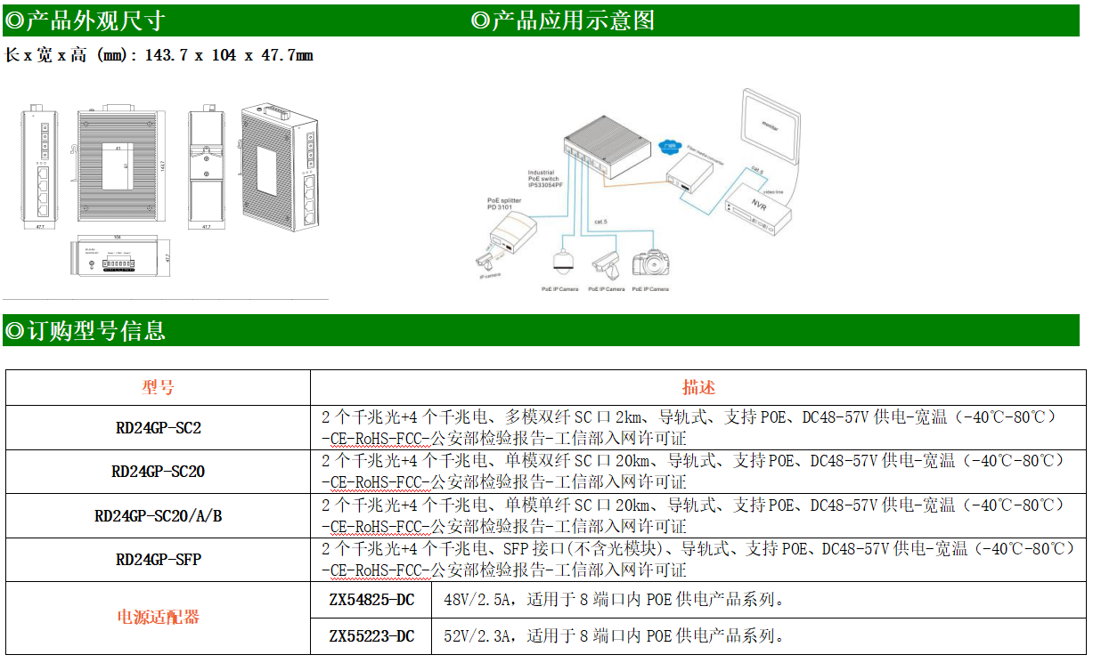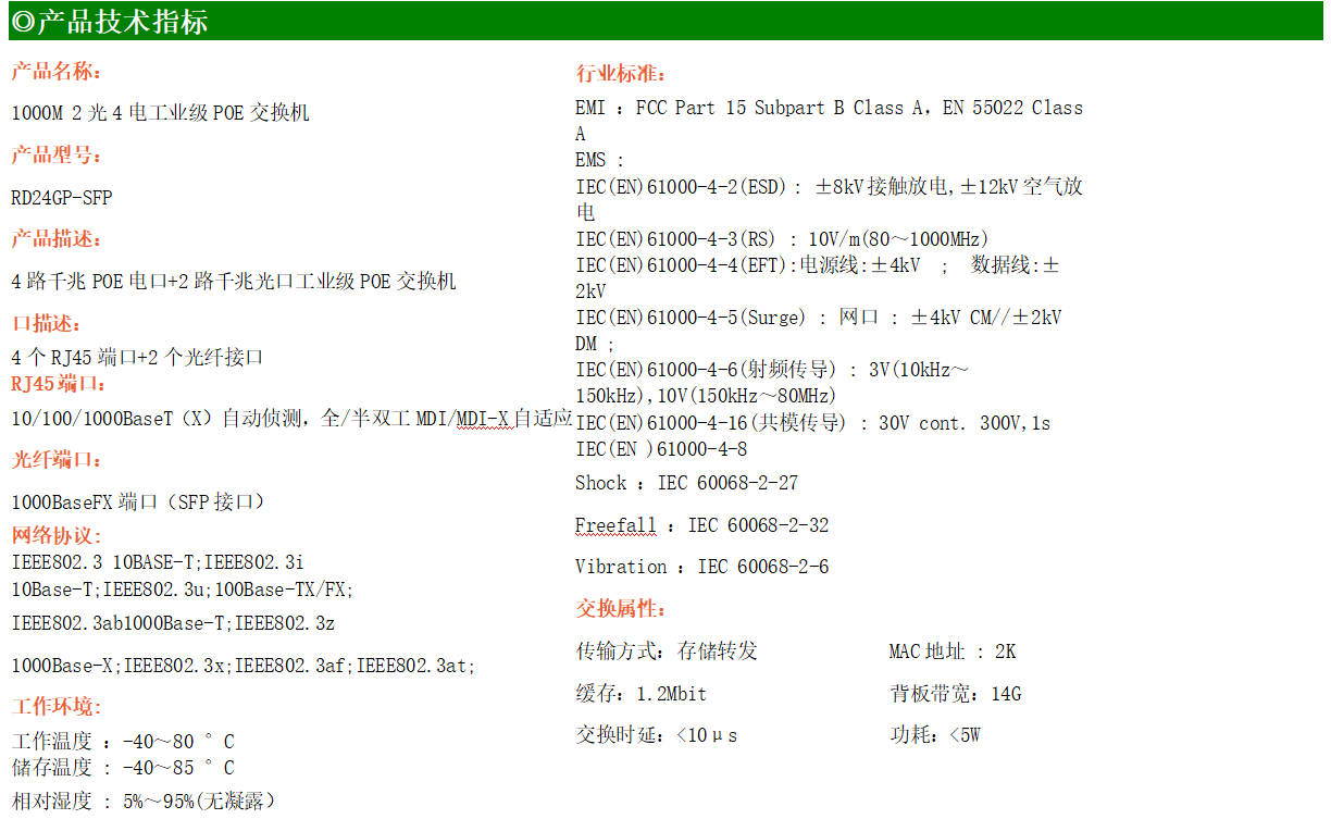 4路千兆POE電口+2路千兆FX光口工業級以太網POE交換機,支持4個10/100/1000Base-TX電口和2個1000Base-X光口。產品符合FCC、CE、ROHS標準。RD24GP-SFP交換機具有-40℃~80℃的工作溫度,具有超強的堅固度能適應各種嚴苛環境,也可以非常方便的安置在空間緊湊的控制箱中。導軌的安裝特性、寬溫操作及擁有IP40防護等級的外殼及LED指示燈,使RD24GP-SFP成為一個即插即用的工業級設備,為用戶的以太網設備聯網提供可靠、便捷的解決方案。