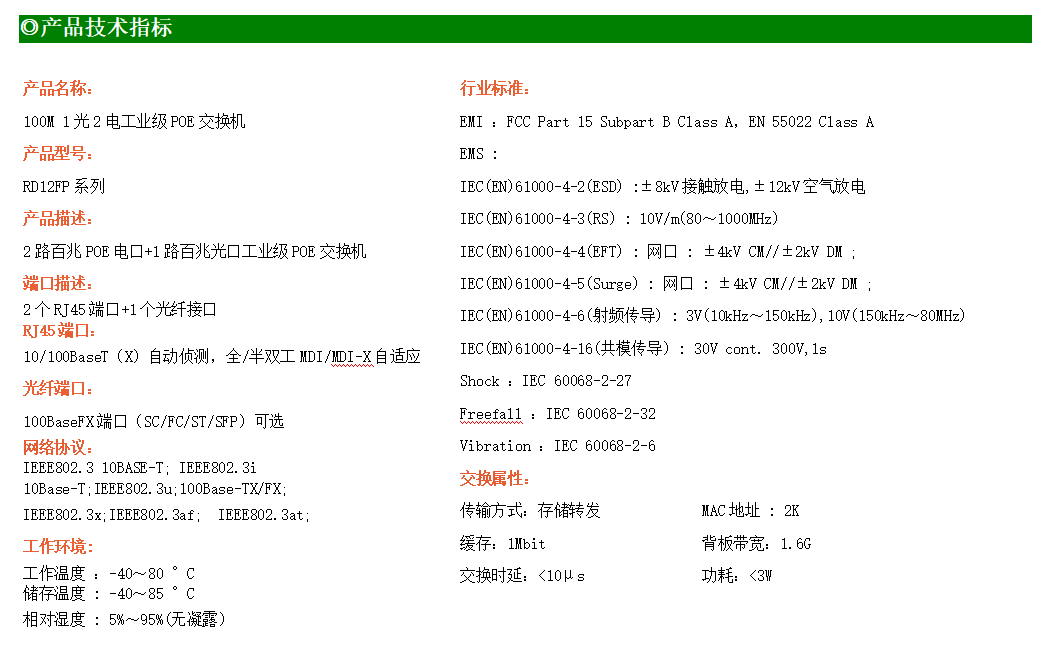 2路百兆POE電口+1路百兆SFP光口工業(yè)級(jí)以太網(wǎng)POE交換機(jī),支持2個(gè)10/100Base-TX電口和1個(gè)100Base-X光口。產(chǎn)品符合FCC、CE、ROHS標(biāo)準(zhǔn)。RD12FP系列交換機(jī)具有-40℃~80℃的工作溫度,具有超強(qiáng)的堅(jiān)固度能適應(yīng)各種嚴(yán)苛環(huán)境,也可以非常方便的安置在空間緊湊的控制箱中。導(dǎo)軌的安裝特性、寬溫操作及擁有IP40防護(hù)等級(jí)的外殼及LED指示燈,使RD12FP成為一個(gè)即插即用的工業(yè)級(jí)設(shè)備,為用戶的以太網(wǎng)設(shè)備聯(lián)網(wǎng)提供可靠、便捷的解決方案。