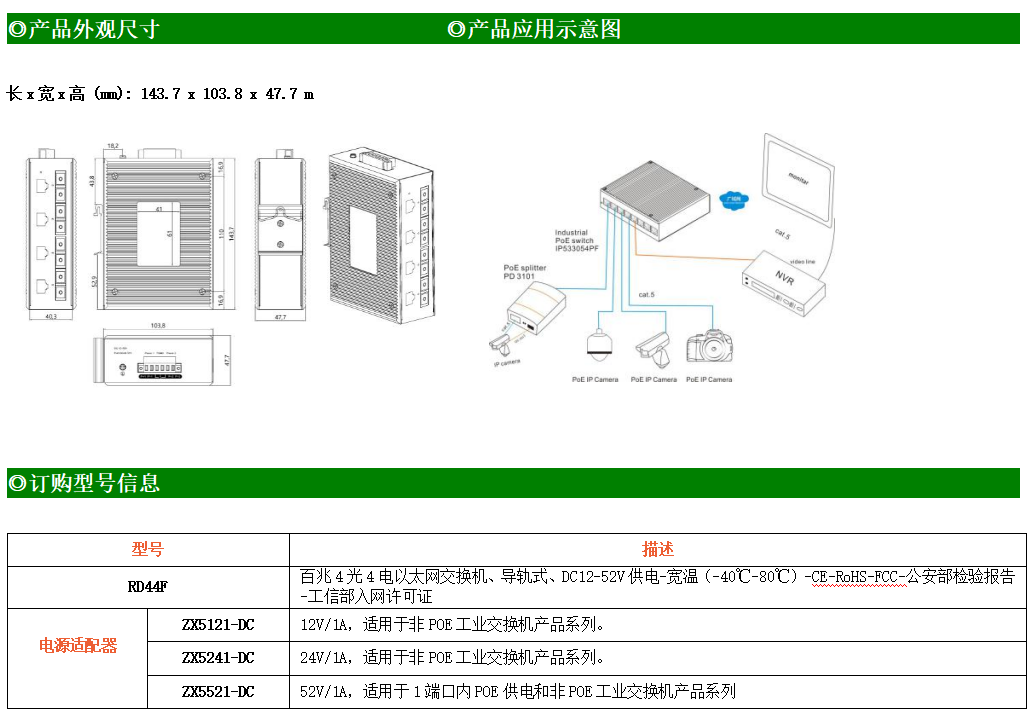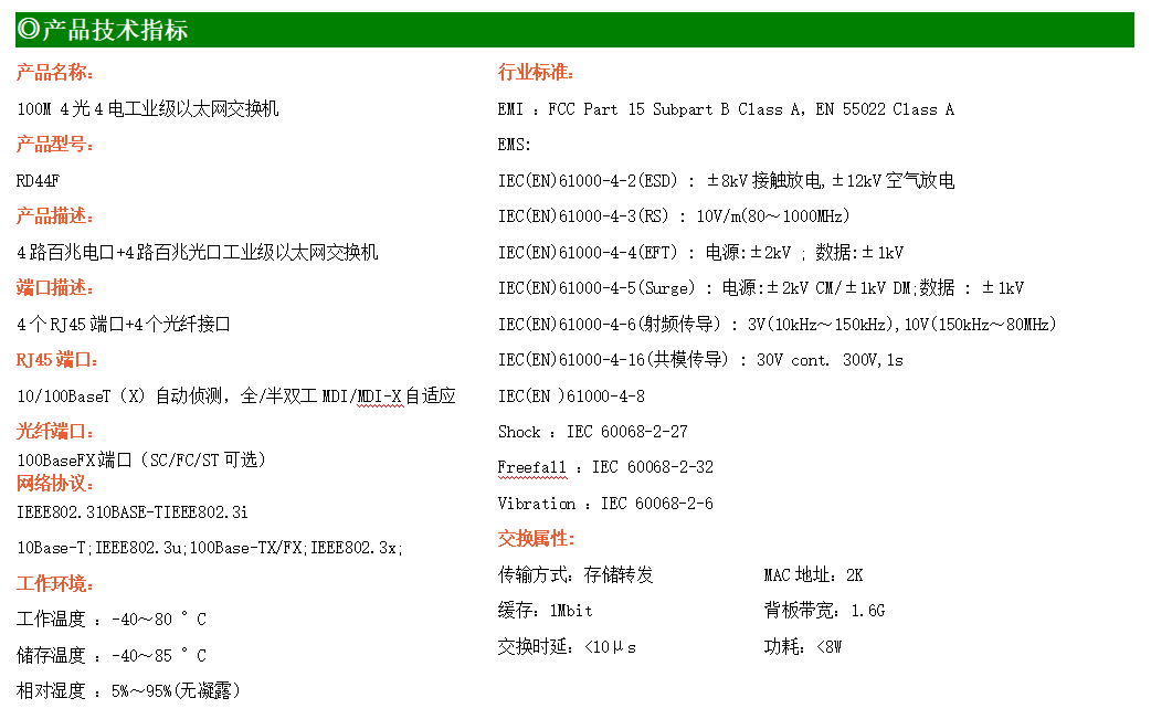 4路百兆電口+4路百兆光口工業(yè)級以太網(wǎng)交換機,支持4個10Base-T/100Base-TX電口和4個100Base-FX(SC/FC/ST可選)光口。產(chǎn)品符合FCC、CE、ROHS標準。RD44F交換機具有-40℃~80℃的工作溫度,具有超強的堅固度能適應(yīng)各種嚴苛環(huán)境,也可以非常方便的安置在空間緊湊的控制箱中。導軌的安裝特性、寬溫操作及擁有IP40防護等級的外殼及LED指示燈,使RD44F成為一個即插即用的工業(yè)級設(shè)備,為用戶的以太網(wǎng)設(shè)備聯(lián)網(wǎng)提供可靠、便捷的解決方案。