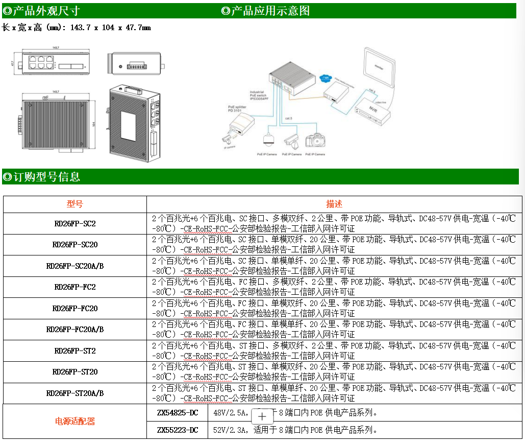 6路百兆POE電口+2路百兆FX光口工業級以太網交換機,支持6個10Base-T/100Base-TX電口和2個100Base-X光口。產品符合FCC、CE、ROHS標準。RD26FP系列交換機具有-40℃~80℃的工作溫度,具有超強的堅固度能適應各種嚴苛環境,也可以非常方便的安置在空間緊湊的控制箱中。導軌的安裝特性、寬溫操作及擁有IP40防護等級的外殼及LED指示燈,使RD26FP成為一個即插即用的工業級設備,為用戶的以太網設備聯網提供可靠、便捷的解決方案。