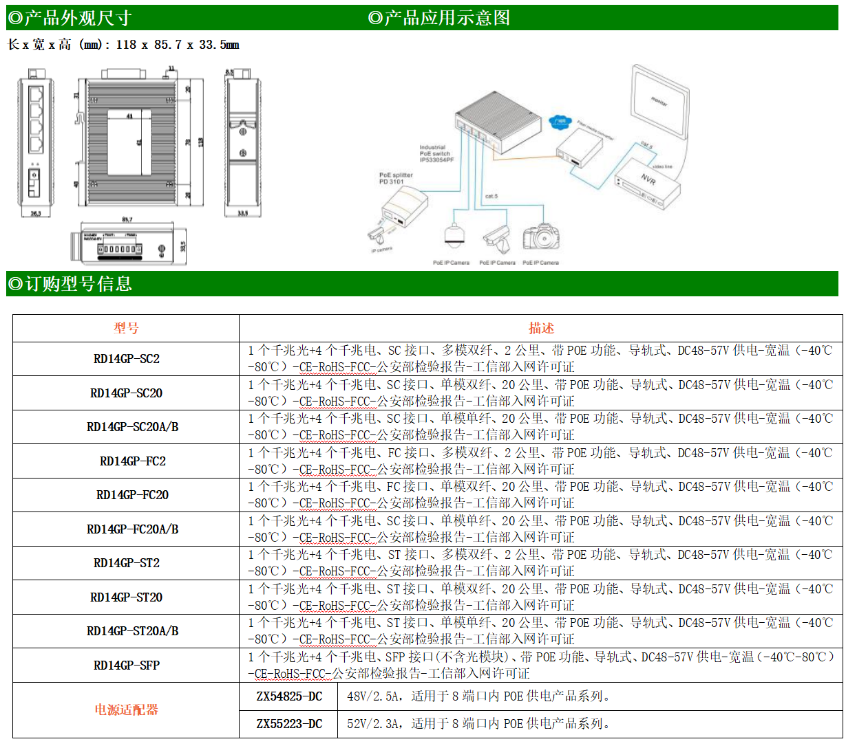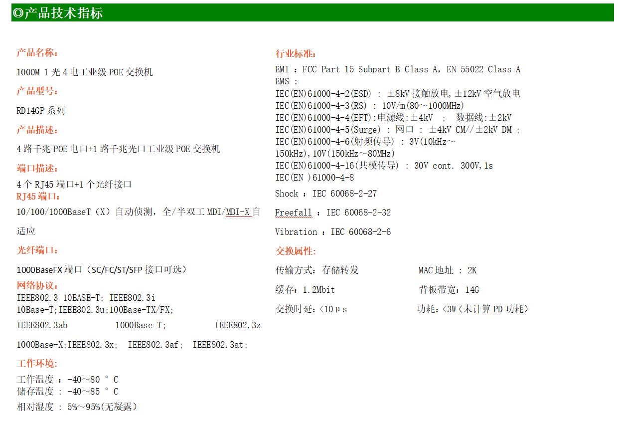 4路千兆POE電口+1路千兆FX光口工業級以太網POE交換機,支持4個10/100/1000Base-TX電口和1個1000Base-X光口。產品符合FCC、CE、ROHS標準。RD14GP系列交換機具有-40℃~80℃的工作溫度,具有超強的堅固度能適應各種嚴苛環境,也可以非常方便的安置在空間緊湊的控制箱中。導軌的安裝特性、寬溫操作及擁有IP40防護等級的外殼及LED指示燈,使RD14GP成為一個即插即用的工業級設備,為用戶的以太網設備聯網提供可靠、便捷的解決方案。