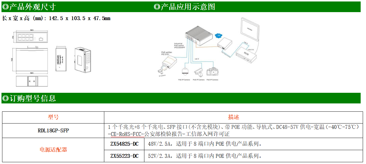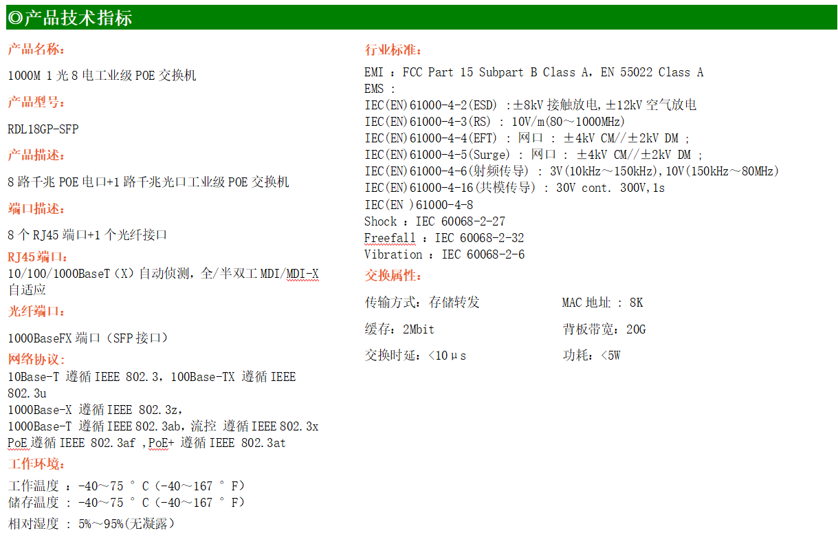 8路千兆POE電口+1路千兆FX光口工業(yè)級以太網(wǎng)POE交換機,支持8個10/100/1000Base-TX電口和1個1000Base-X光口。產(chǎn)品符合FCC、CE、ROHS標(biāo)準(zhǔn)。RDL18GP交換機具有-40℃~75℃的工作溫度,具有超強的堅固度能適應(yīng)各種嚴(yán)苛環(huán)境,也可以非常方便的安置在空間緊湊的控制箱中。導(dǎo)軌的安裝特性、寬溫操作及擁有IP40防護等級的外殼及LED指示燈,使RDL18GP成為一個即插即用的工業(yè)級設(shè)備,為用戶的以太網(wǎng)設(shè)備聯(lián)網(wǎng)提供可靠、便捷的解決方案。