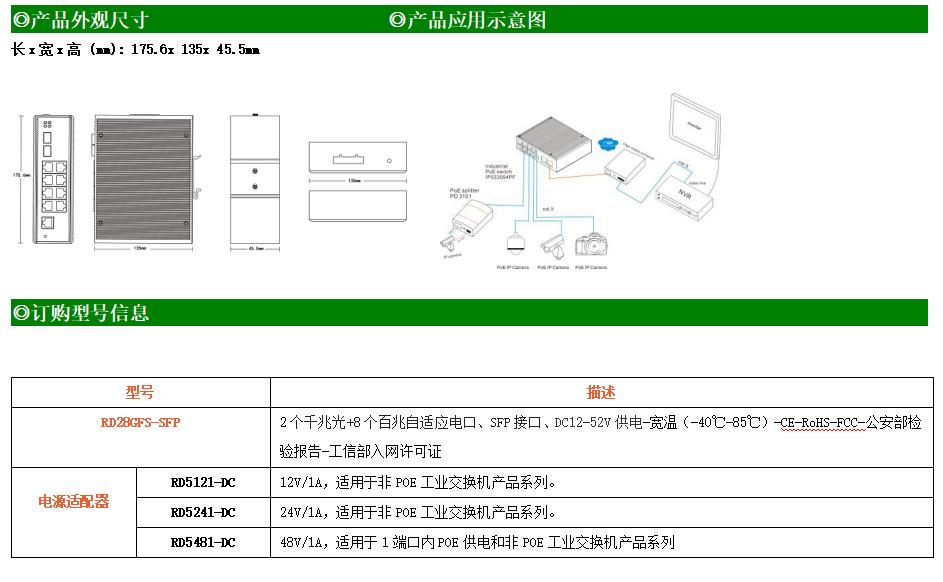 RD28GFS-SFP是網管型工業以太網交換機,產品符合FCC、CE、ROHS標準。支持2個千兆光口和8個百兆電口,支持一路console口;支持工業現場所需的以太網二層協議,保證通信網絡的穩定性;該系列交換機采用低功耗、無風扇設計,確保無噪聲干擾,同時支持-40~85℃工作溫度和良好的EMC電磁兼容性能,保證在惡劣的工業環境中保持穩定的工作,為工廠自動化,智能交通,視頻監控等工業應用領域組建快速穩定的網絡終端接入網絡提供安全可靠的解決方案。