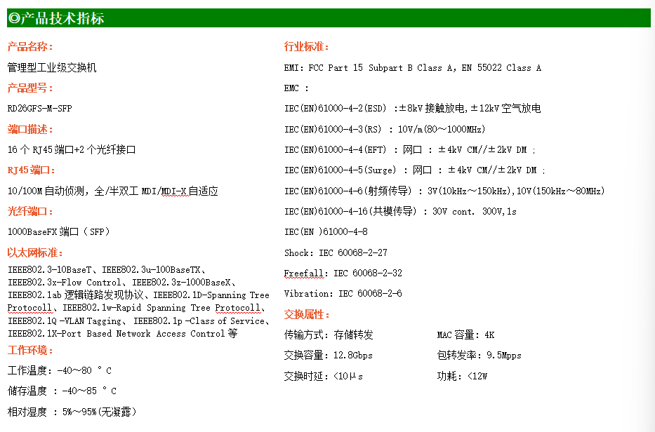 RD216GFS-M是網管型工業以太網交換機,產品符合FCC、CE、RoHS標準。支持2個千兆光口和16個百兆電口;支持工業現場所需的以太網二層協議,保證通信網絡的穩定性;該系列交換機采用低功耗、無風扇設計,確保無噪聲干擾,同時支持-40~80℃工作溫度和良好的EMC電磁兼容性能,保證在惡劣的工業環境中保持穩定的工作,為工廠自動化,智能交通,視頻監控等工業應用領域組建快速穩定的網絡終端接入網絡提供安全可靠的解決方案。