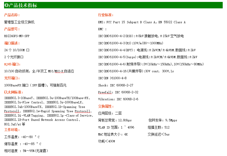 RD224GFSP-MU-AC-SFP是網(wǎng)管型工業(yè)以太網(wǎng)PoE交換機(jī),產(chǎn)品符合FCC、CE、RoHS標(biāo)準(zhǔn)。可提供24個百兆PoE端口,所有PoE端口符合IEEE802.3af/at標(biāo)準(zhǔn)。支持工業(yè)現(xiàn)場所需的以太網(wǎng)二層協(xié)議,保證通信網(wǎng)絡(luò)的穩(wěn)定性;該系列交換機(jī)采用低功耗、無風(fēng)扇設(shè)計,確保無噪聲干擾,同時支持-40~85℃工作溫度和良好的EMC電磁兼容性能,保證在惡劣的工業(yè)環(huán)境中保持穩(wěn)定的工作,為工廠自動化,智能交通,視頻監(jiān)控等工業(yè)應(yīng)用領(lǐng)域組建快速穩(wěn)定的網(wǎng)絡(luò)終端接入網(wǎng)絡(luò)提供安全可靠的解決方案。