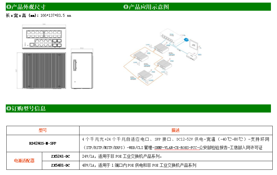RD424GS-M-SFP是網管型工業以太網交換機,產品符合FCC、CE、RoHS標準。支持4個千兆光口和24個千兆電口;支持工業現場所需的以太網二層協議,保證通信網絡的穩定性;該系列交換機采用低功耗、無風扇設計,確保無噪聲干擾,同時支持-40~80℃工作溫度和良好的EMC電磁兼容性能,保證在惡劣的工業環境中保持穩定的工作,為工廠自動化,智能交通,視頻監控等工業應用領域組建快速穩定的網絡終端接入網絡提供安全可靠的解決方案。