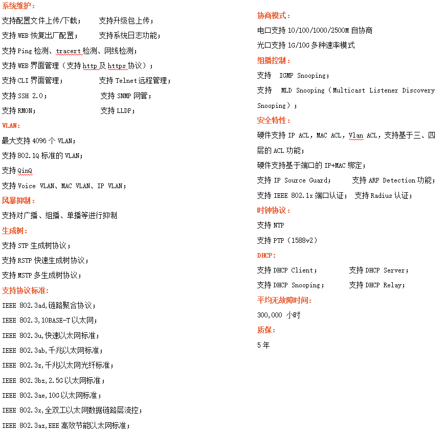 ●網(wǎng)絡(luò)冗余:支持STP/RSTP/MSTP,支持ERPS(自愈時(shí)間<20ms)