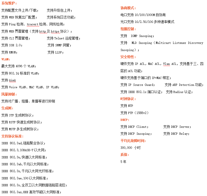 ●網絡冗余:支持STP/RSTP/MSTP,支持ERPS(自愈時間<20ms)