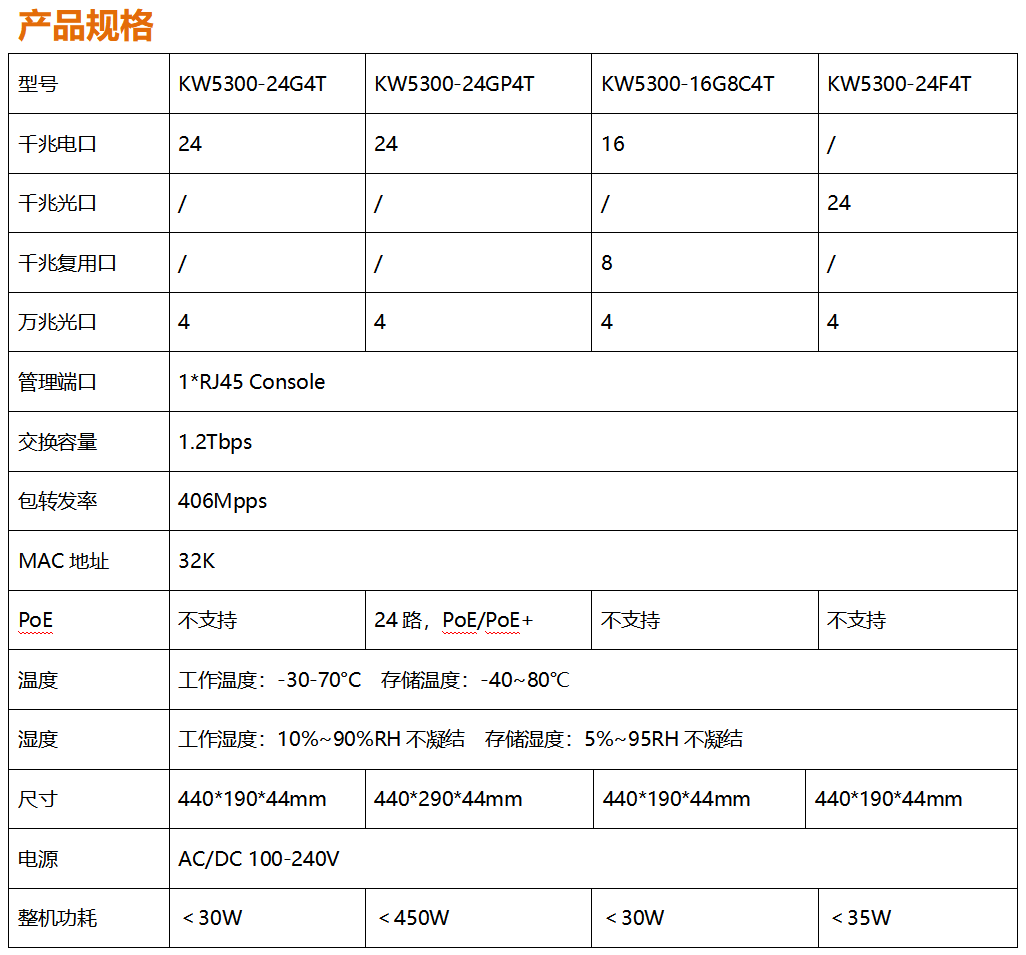 全新開發推出的KW5300系列全千兆網管寬溫交換機,采用新一代高性能硬件和軟件平臺,提供靈活、高性價比的全千兆接入和上行端口,支持完備的安全防護機制、完善的ACL/QoS策略和靈活的VLAN功能,易于管理維護,滿足用戶對于網絡設備易管理、高安全、高性能、低成本的組網需求,專為市政、銀行、教育、醫院、酒店、網吧、數據中心等室內項目以及戶外新基建項目定制系列,能滿足大規模的市場需求。