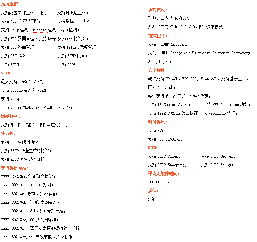 ●VLAN:支持802.1Q VLAN、QinQ、Voice VLAN、MAC VLAN、IP VLAN