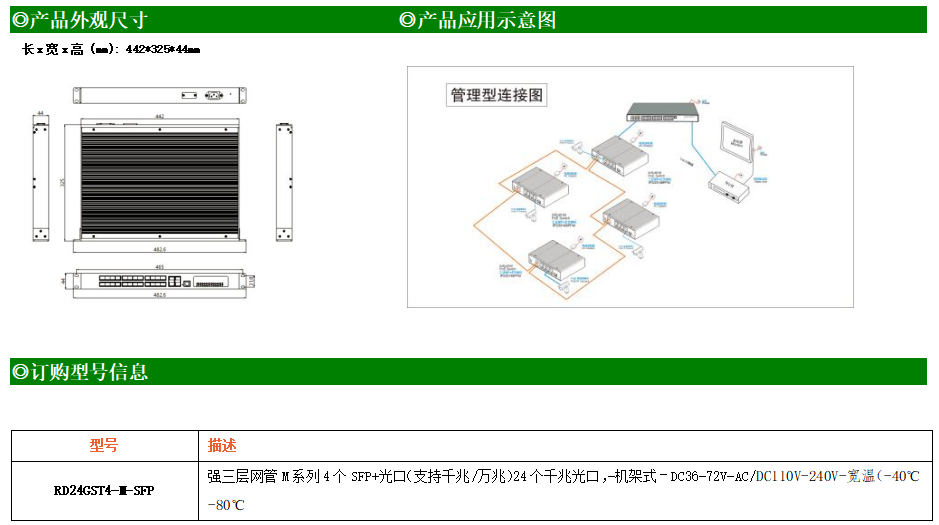 RD24GST4-M-SFP交換機(jī)是我司推出的一款萬兆三層交換機(jī),配備4個(gè)萬兆SFP+光口和24個(gè)千兆光口,具備先進(jìn)的硬件處理能力和最豐富的業(yè)務(wù)特性。支持IPv4/IPv6 硬件雙棧及線速轉(zhuǎn)發(fā),使客戶能夠從容應(yīng)對即將帶來的IPv6 時(shí)代其提供高容量的交換能力。RD24GST4-M-SFP交換機(jī)具有-40℃~80℃的工作溫度,具有超強(qiáng)的堅(jiān)固度能適應(yīng)各種嚴(yán)苛環(huán)境。導(dǎo)軌式安裝特性、寬溫操作,使RD24GST4-M-SFP的交換機(jī)成為一個(gè)即插即用的工業(yè)級(jí)設(shè)備,為用戶的以太網(wǎng)設(shè)備聯(lián)網(wǎng)提供可靠、便捷的解決方案。