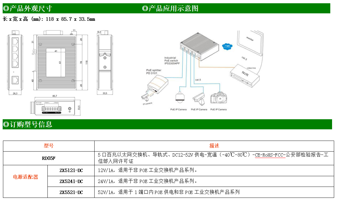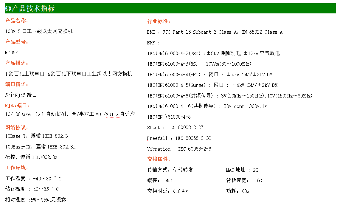 1路百兆上聯電口+4路百兆下聯電口工業級以太網交換機,支持1個10/100Base-TX上聯電口和4個10Base-T/100Base-TX下聯電口。產品符合FCC、CE、ROHS標準。RD05F交換機具有-40℃~80℃的工作溫度,具有超強的堅固度能適應各種嚴苛環境,也可以非常方便的安置在空間緊湊的控制箱中。導軌的安裝特性、寬溫操作及擁有IP40防護等級的外殼及LED指示燈,使RD05F成為一個即插即用的工業級設備,為用戶的以太網設備聯網提供可靠、便捷的解決方案。