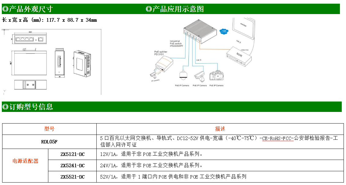 1路百兆上聯電口+4路百兆下聯電口工業級以太網交換機,支持1個10/100Base-TX上聯電口和4個10Base-T/100Base-TX下聯電口。產品符合FCC、CE、ROHS標準。RDL05F交換機具有-40℃~75℃的工作溫度,具有超強的堅固度能適應各種嚴苛環境,也可以非常方便的安置在空間緊湊的控制箱中。導軌的安裝特性、寬溫操作及擁有IP40防護等級的外殼及LED指示燈,使RDL05F成為一個即插即用的工業級設備,為用戶的以太網設備聯網提供可靠、便捷的解決方案。