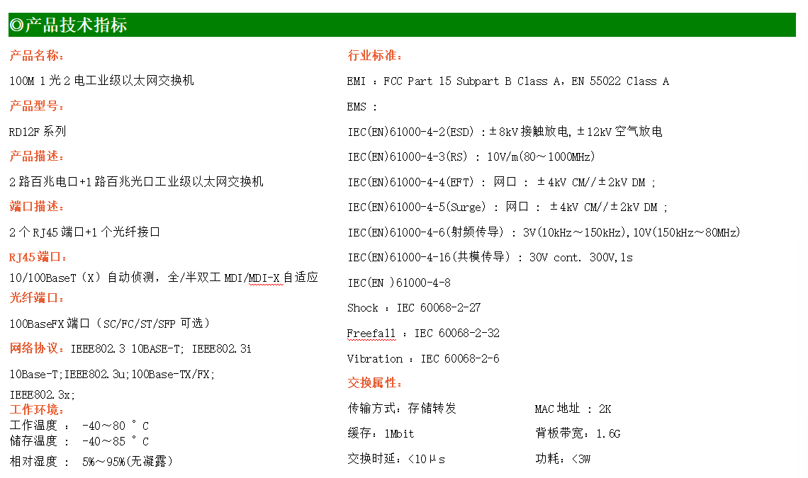 2路百兆電口+1路百兆FX光口工業(yè)級以太網(wǎng)交換機,支持2個10Base-T/100Base-TX電口和1個100Base-X光口。產(chǎn)品符合FCC、CE、ROHS標準。RD12F系列交換機具有-40℃~80℃的工作溫度,具有超強的堅固度能適應各種嚴苛環(huán)境,也可以非常方便的安置在空間緊湊的控制箱中。導軌的安裝特性、寬溫操作及擁有IP40防護等級的外殼及LED指示燈,使RD12F成為一個即插即用的工業(yè)級設備,為用戶的以太網(wǎng)設備聯(lián)網(wǎng)提供可靠、便捷的解決方案。