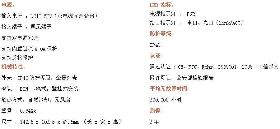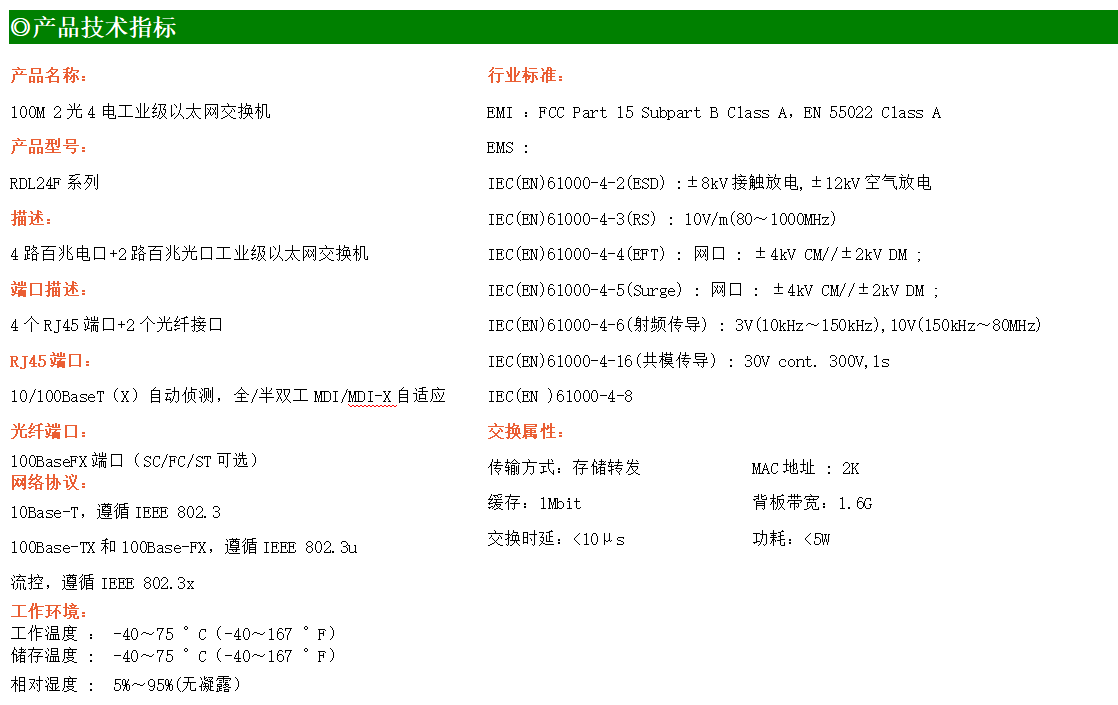4路百兆電口+2路百兆FX光口工業級以太網交換機,支持4個10Base-T/100Base-TX電口和2個100Base-X光口。產品符合FCC、CE、ROHS標準。RDL24F系列交換機具有-40℃~75℃的工作溫度,具有超強的堅固度能適應各種嚴苛環境,也可以非常方便的安置在空間緊湊的控制箱中。導軌的安裝特性、寬溫操作及擁有IP40防護等級的外殼及LED指示燈,使RDL24F成為一個即插即用的工業級設備,為用戶的以太網設備聯網提供可靠、便捷的解決方案。