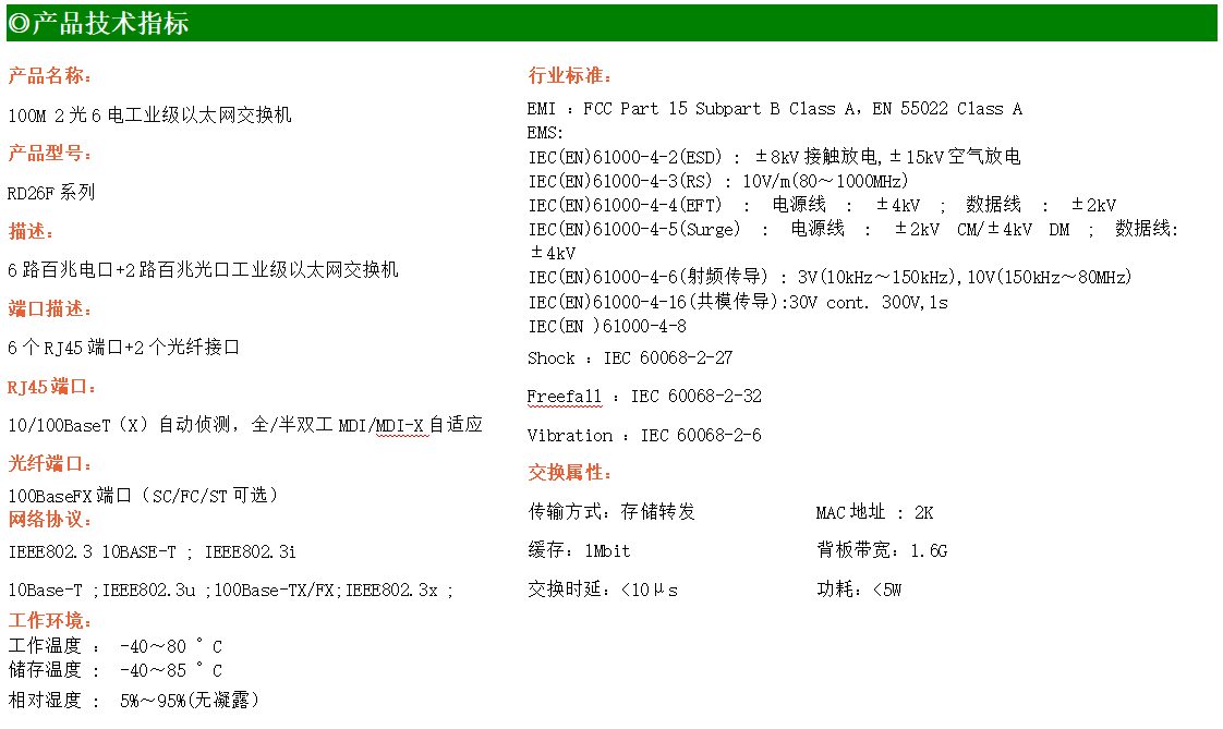 6路百兆電口+2路百兆FX光口工業級以太網交換機,支持6個10Base-T/100Base-TX電口和2個100Base-X光口。產品符合FCC、CE、ROHS標準。RD26F系列交換機具有-40℃~80℃的工作溫度,具有超強的堅固度能適應各種嚴苛環境,也可以非常方便的安置在空間緊湊的控制箱中。導軌的安裝特性、寬溫操作及擁有IP40防護等級的外殼及LED指示燈,使RD26F成為一個即插即用的工業級設備,為用戶的以太網設備聯網提供可靠、便捷的解決方案。