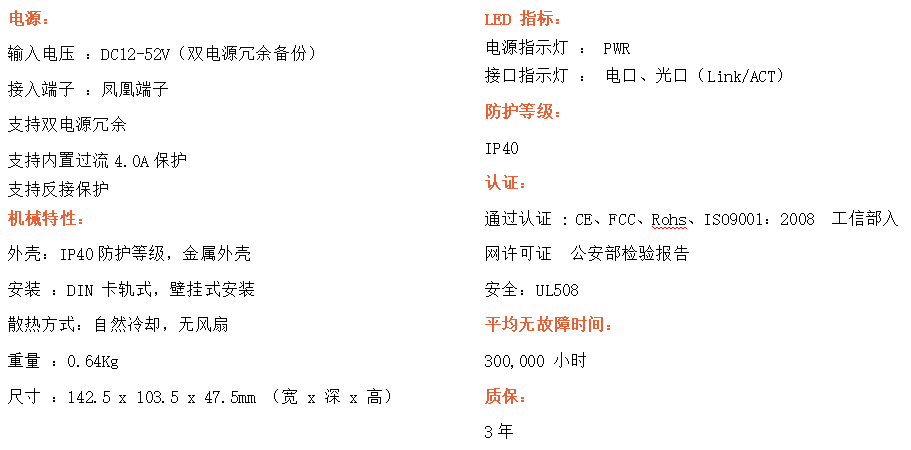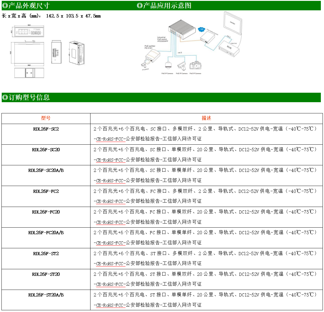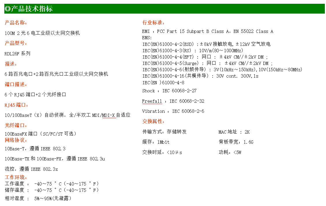 6路百兆電口+2路百兆FX光口工業級以太網交換機,支持6個10Base-T/100Base-TX電口和2個100Base-X光口。產品符合FCC、CE、ROHS標準。RDL26F系列交換機具有-40℃~75℃的工作溫度,具有超強的堅固度能適應各種嚴苛環境,也可以非常方便的安置在空間緊湊的控制箱中。導軌的安裝特性、寬溫操作及擁有IP40防護等級的外殼及LED指示燈,使RDL26F成為一個即插即用的工業級設備,為用戶的以太網設備聯網提供可靠、便捷的解決方案。