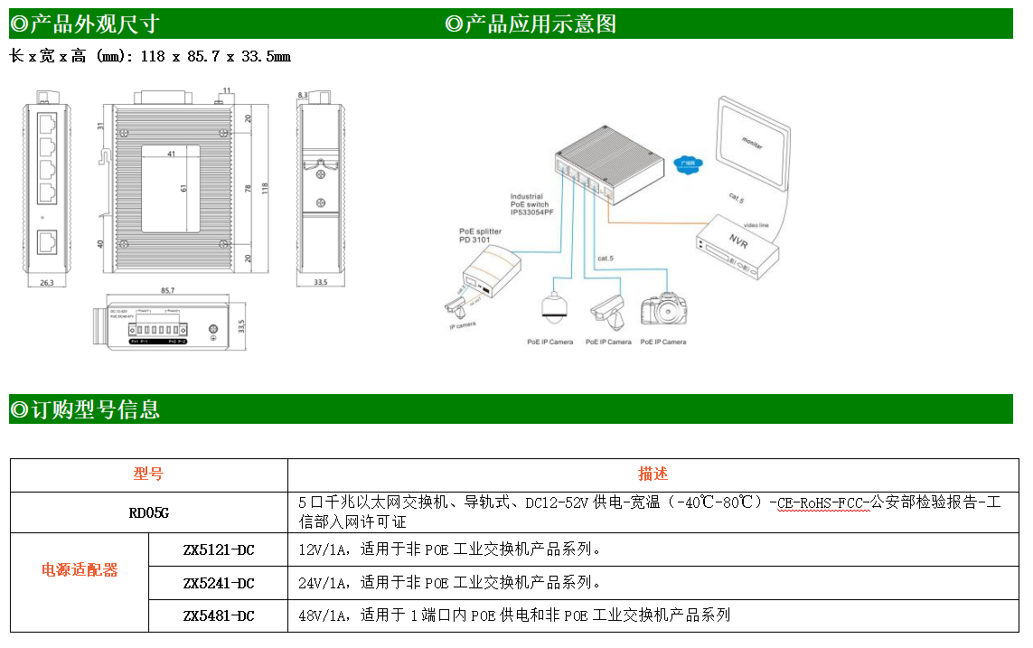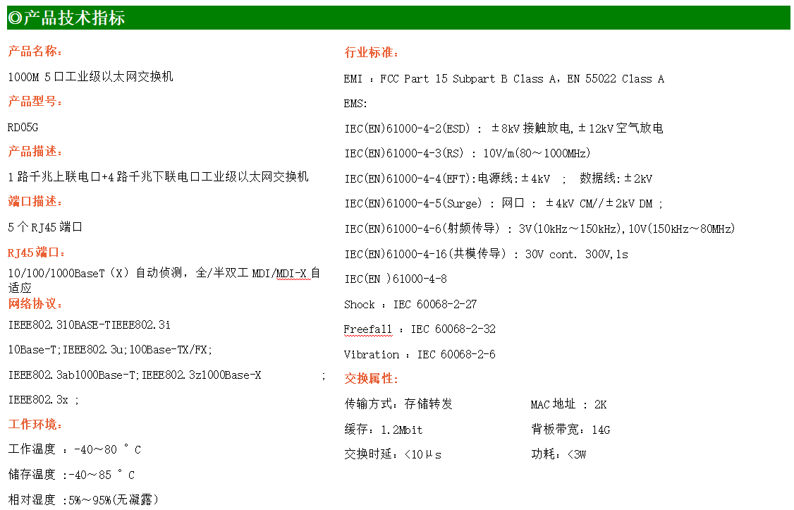1路千兆上聯(lián)電口+4路千兆下聯(lián)電口工業(yè)級以太網(wǎng)交換機,支持1個10/100/1000Base-TX上聯(lián)電口和4個10/100/1000Base-TX下聯(lián)電口。產(chǎn)品符合FCC、CE、ROHS標(biāo)準(zhǔn)。RD05G交換機具有-40℃~80℃的工作溫度,具有超強的堅固度能適應(yīng)各種嚴苛環(huán)境,也可以非常方便的安置在空間緊湊的控制箱中。導(dǎo)軌的安裝特性、寬溫操作及擁有IP40防護等級的外殼及LED指示燈,使RD05G成為一個即插即用的工業(yè)級設(shè)備,為用戶的以太網(wǎng)設(shè)備聯(lián)網(wǎng)提供可靠、便捷的解決方案。