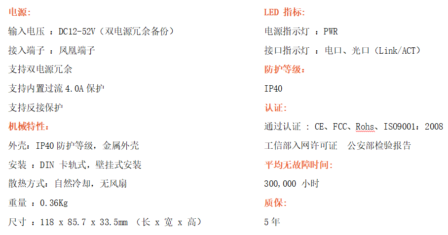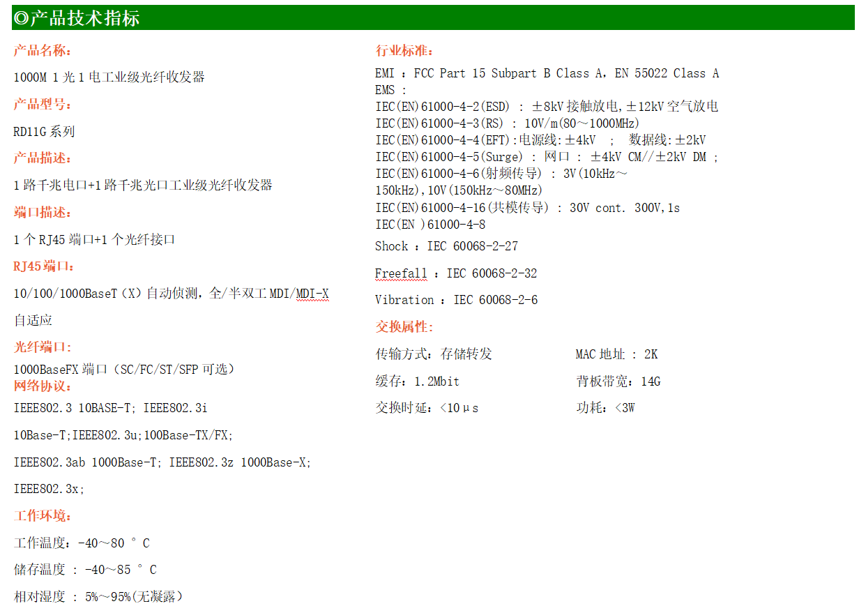 1路千兆電口+1路千兆FX光口工業級以太網交換機,支持1個10Base-T/100Base-T/1000Base-TX電口和1個1000Base-X光口。產品符合FCC、CE、ROHS標準。RD11G系列交換機具有-40℃~80℃的工作溫度,具有超強的堅固度能適應各種嚴苛環境,也可以非常方便的安置在空間緊湊的控制箱中。導軌的安裝特性、寬溫操作及擁有IP40防護等級的外殼及LED指示燈,使RD11G成為一個即插即用的工業級設備,為用戶的以太網設備聯網提供可靠、便捷的解決方案。