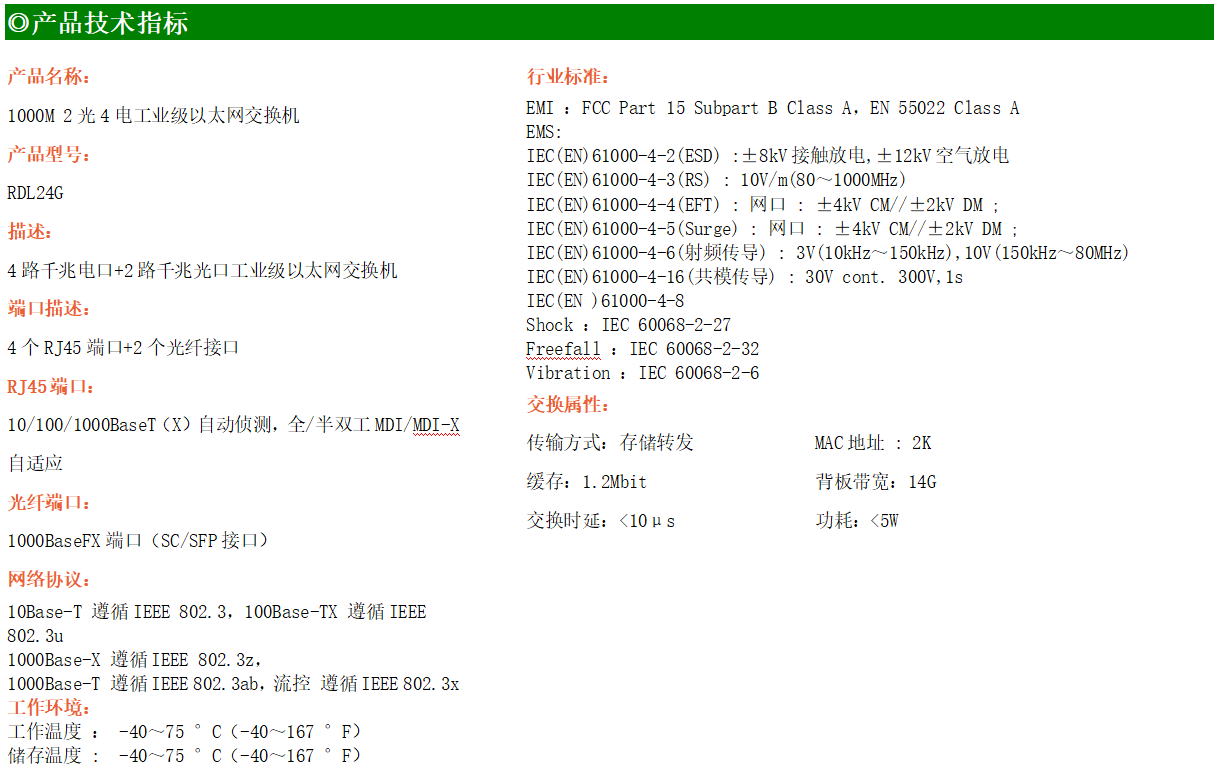4路千兆電口+2路千兆FX光口工業(yè)級以太網(wǎng)交換機(jī),支持4個100Base-T/1000Base-TX電口和2個1000Base-X光口。產(chǎn)品符合FCC、CE、ROHS標(biāo)準(zhǔn)。RDL24G交換機(jī)具有-40℃~75℃的工作溫度,具有超強(qiáng)的堅(jiān)固度能適應(yīng)各種嚴(yán)苛環(huán)境,也可以非常方便的安置在空間緊湊的控制箱中。導(dǎo)軌的安裝特性、寬溫操作及擁有IP40防護(hù)等級的外殼及LED指示燈,使RDL24G成為一個即插即用的工業(yè)級設(shè)備,為用戶的以太網(wǎng)設(shè)備聯(lián)網(wǎng)提供可靠、便捷的解決方案。