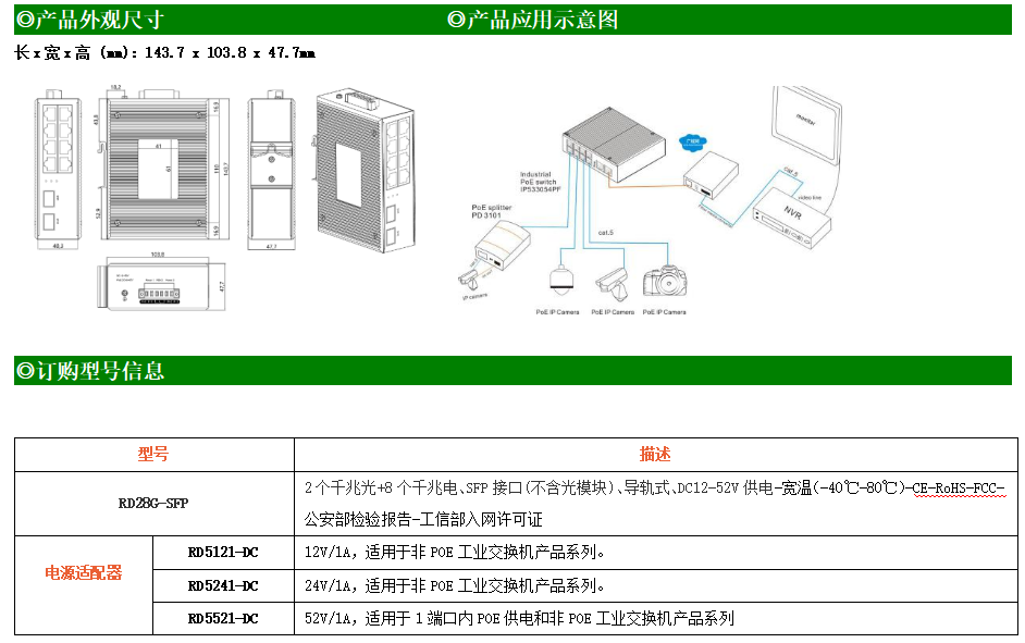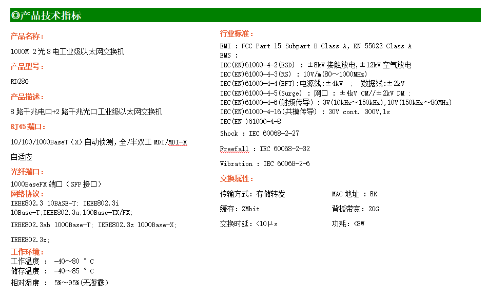 8路千兆電口+2路千兆FX光口工業級以太網交換機,支持8個100Base-T/1000Base-TX電口和2個1000Base-X光口。產品符合FCC、CE、ROHS標準。RD28G交換機具有-40℃~80℃的工作溫度,具有超強的堅固度能適應各種嚴苛環境,也可以非常方便的安置在空間緊湊的控制箱中。導軌的安裝特性、寬溫操作及擁有IP40防護等級的外殼及LED指示燈,使RD28G成為一個即插即用的工業級設備,為用戶的以太網設備聯網提供可靠、便捷的解決方案。