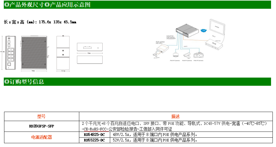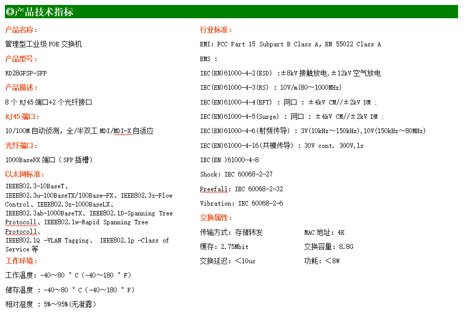 RD28GFSP-SFP是網管型工業以太網POE交換機,產品符合FCC、CE、ROHS標準。支持2個千兆光口和8個百兆電口,支持一路console口;支持工業現場所需的以太網二層協議,保證通信網絡的穩定性;該系列交換機采用低功耗、無風扇設計,確保無噪聲干擾,同時支持-40~85℃工作溫度和良好的EMC電磁兼容性能,保證在惡劣的工業環境中保持穩定的工作,為工廠自動化,智能交通,視頻監控等工業應用領域組建快速穩定的網絡終端接入網絡提供安全可靠的解決方案。
