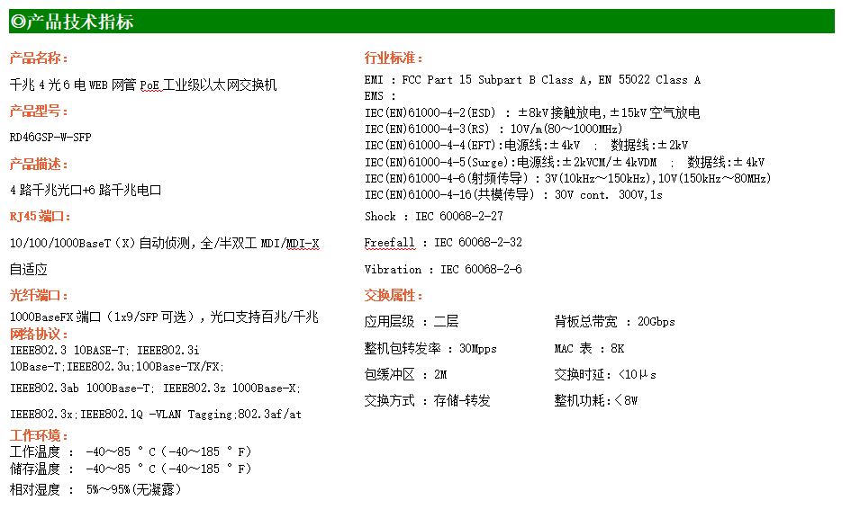 RD46GSP-W-SFP系列WEB網(wǎng)管工業(yè)級以太網(wǎng)交換機,產品符合FCC、CE、ROHS標準,支持工業(yè)現(xiàn)場所需的以太網(wǎng)二層協(xié)議,保證通信網(wǎng)絡的穩(wěn)定性。該系列交換機采用低功耗、無風扇設計,確保無噪聲干擾,同時支持-40~85℃工作溫度和良好的EMC電磁兼容性能,保證在惡劣的工業(yè)環(huán)境中保持穩(wěn)定的工作,為工廠自動化,智能交通,視頻監(jiān)控等工業(yè)應用領域組建快速穩(wěn)定的網(wǎng)絡終端接入網(wǎng)絡提供安全可靠的解決方案。