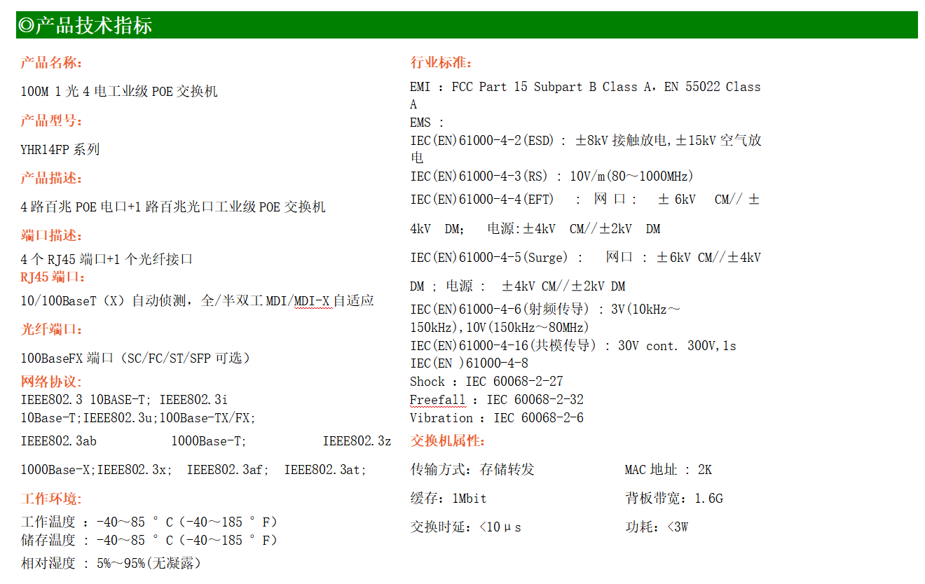 4路百兆POE電口+1路百兆FX光口工業(yè)級(jí)以太網(wǎng)POE交換機(jī),支持4個(gè)10/100Base-TX電口和1個(gè)100Base-X光口。產(chǎn)品符合FCC、CE、ROHS標(biāo)準(zhǔn)。YHR14FP系列交換機(jī)具有-40℃~85℃的工作溫度,具有超強(qiáng)的堅(jiān)固度能適應(yīng)各種嚴(yán)苛環(huán)境,也可以非常方便的安置在空間緊湊的控制箱中。導(dǎo)軌的安裝特性、寬溫操作及擁有IP40防護(hù)等級(jí)的外殼及LED指示燈,使YHR14FP成為一個(gè)即插即用的工業(yè)級(jí)設(shè)備,為用戶的以太網(wǎng)設(shè)備聯(lián)網(wǎng)提供可靠、便捷的解決方案。